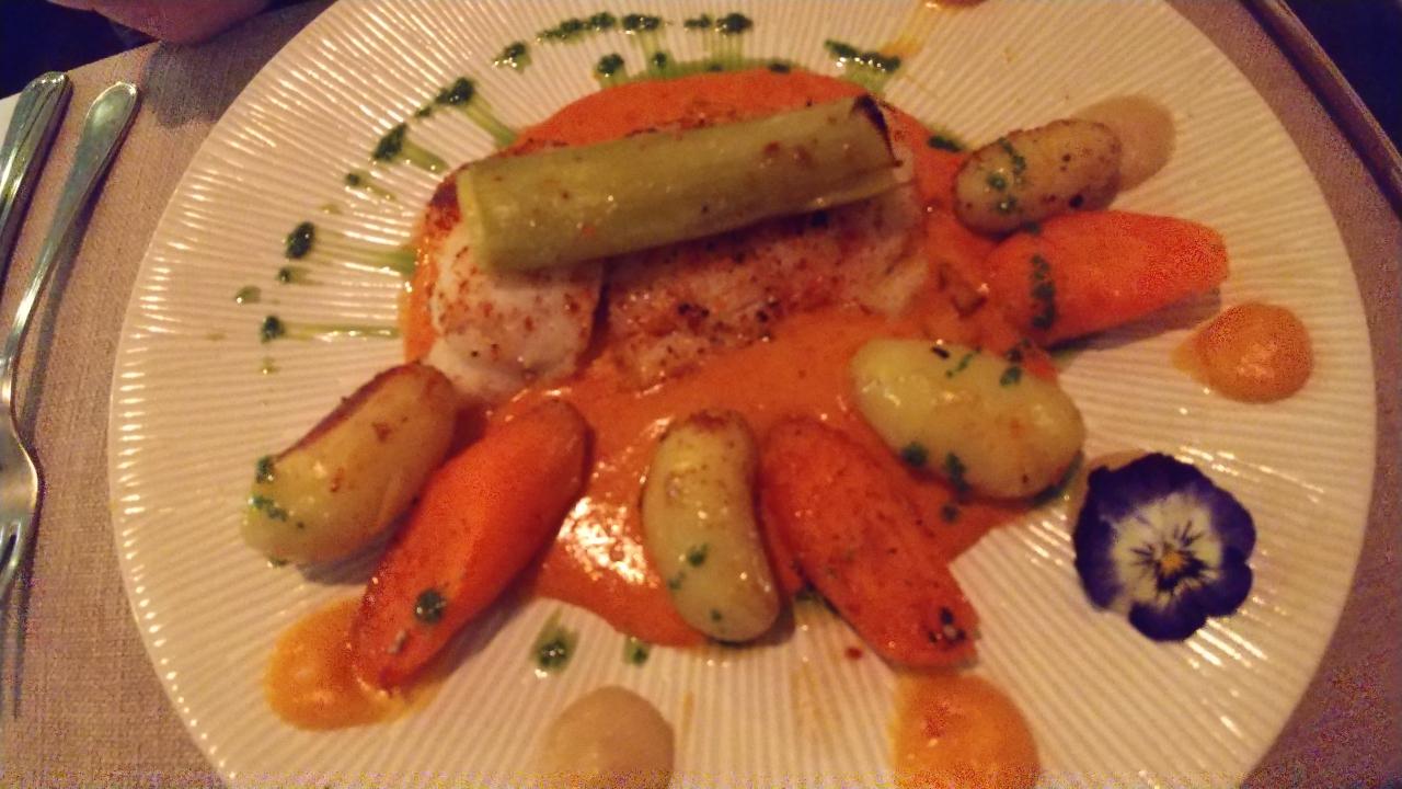 妻のメイン、タラのグリル。盛り付けが美しい。