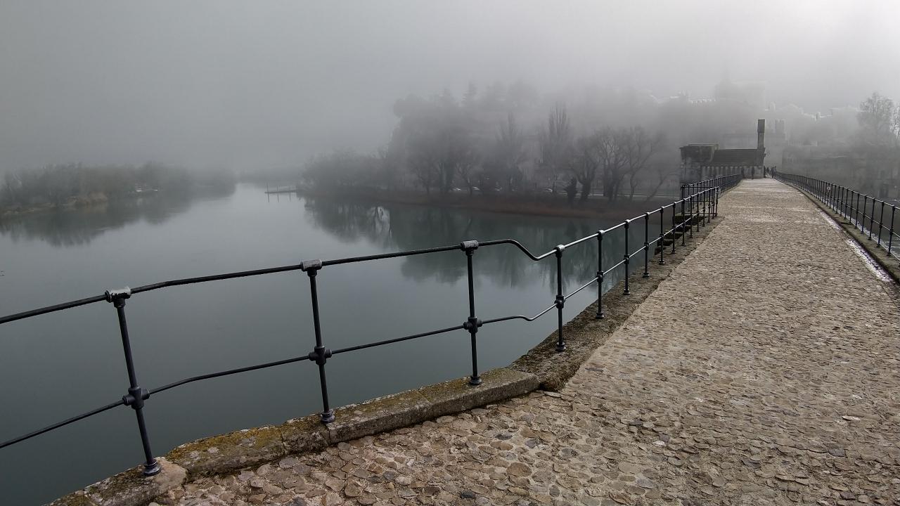 振り返れば橋のたもと。その奥のアヴィニョンの城郭はもう霧の中です。