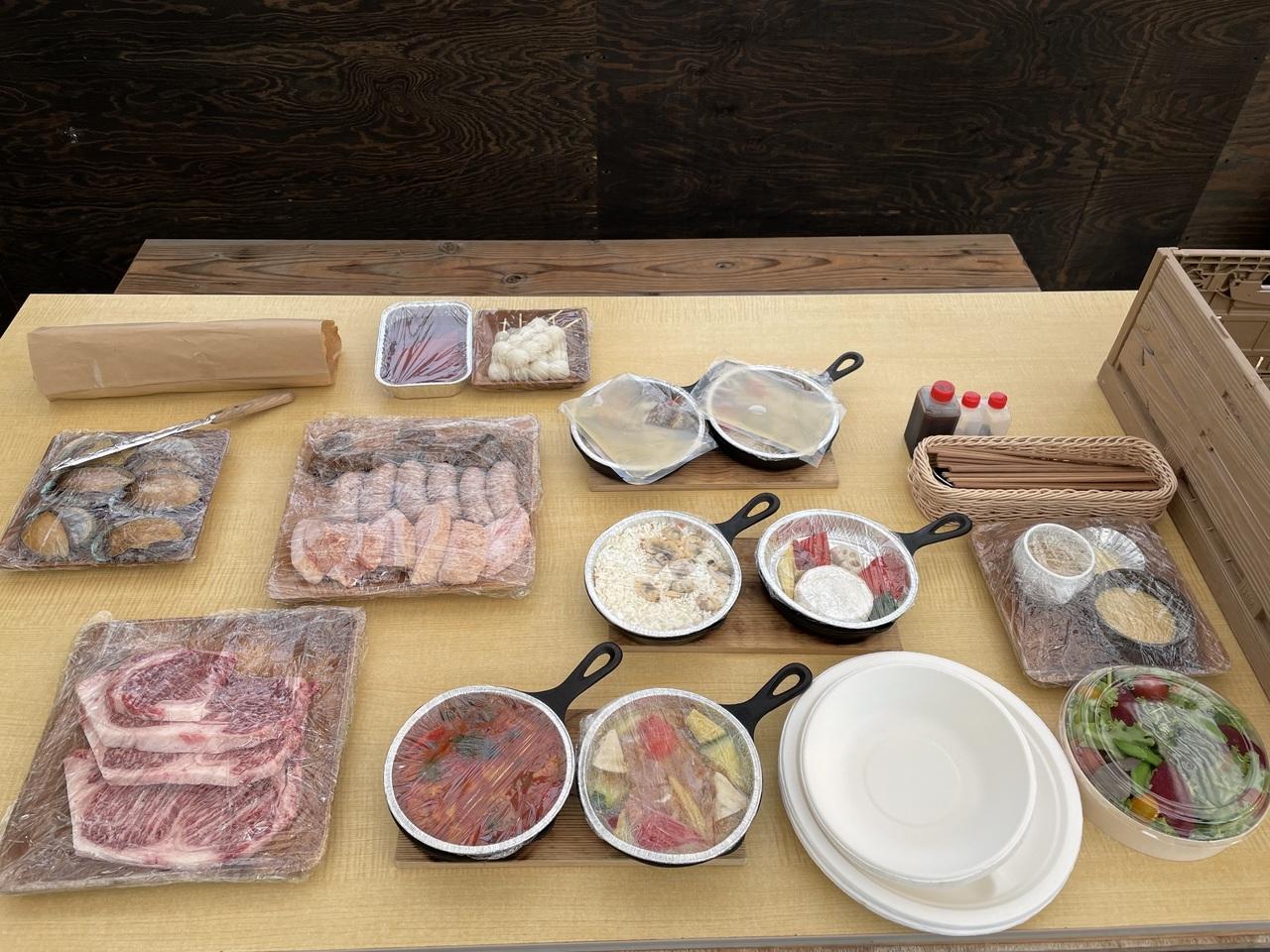 夕食のセット。大人6人なので、この量プラス道の駅で買った海鮮でちょっと多かったです。