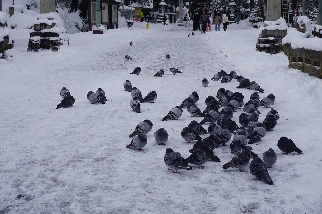 こんな雪道にハトさんが、集まってじっとしています。