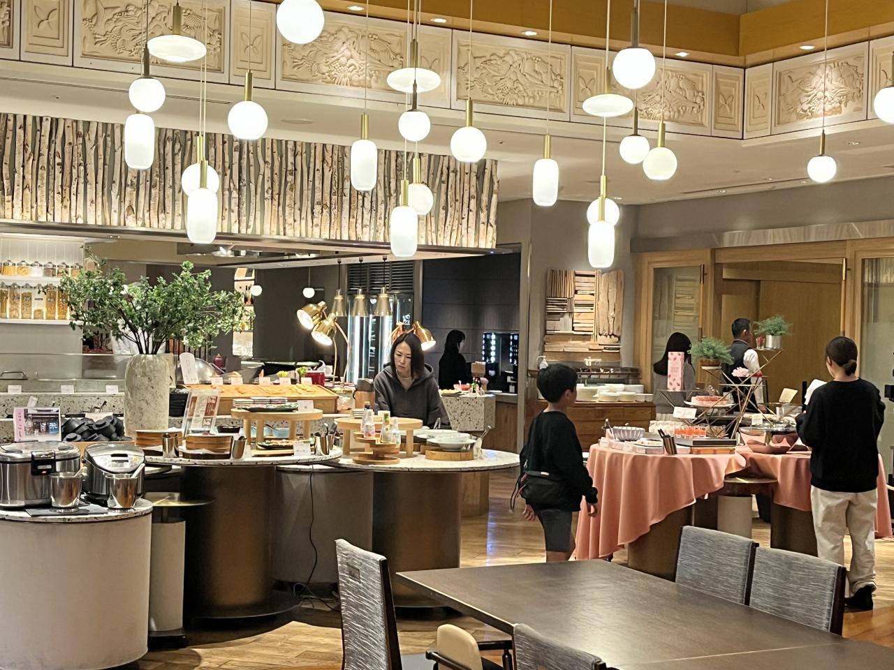 朝食はホテルのレストラン「彩」でモーニングビュッフェ。少し遅めの8時半頃に足を運びましたが、それでもかなりの賑わいで、このホテルの人気ぶりが朝からよくわかります。 -