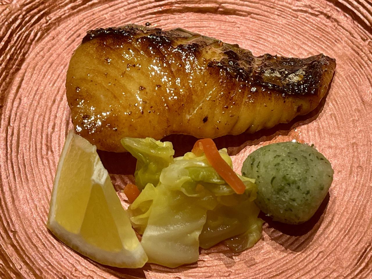 続いての焼き物は、鰆の山椒焼き。添えられていたのは、野沢菜おろしと新キャベツの辛子漬けです。