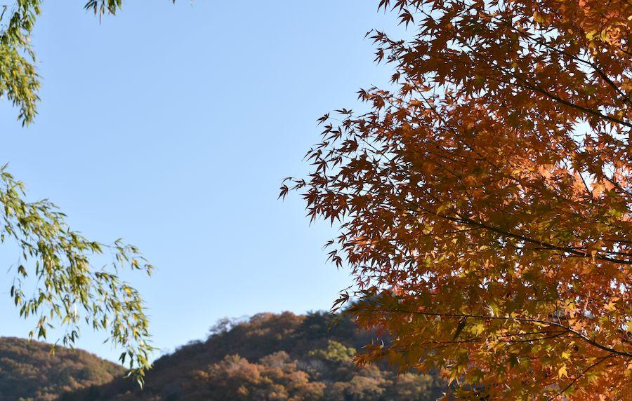 まだ日が低くて紅葉が白っぽく見える時間です。