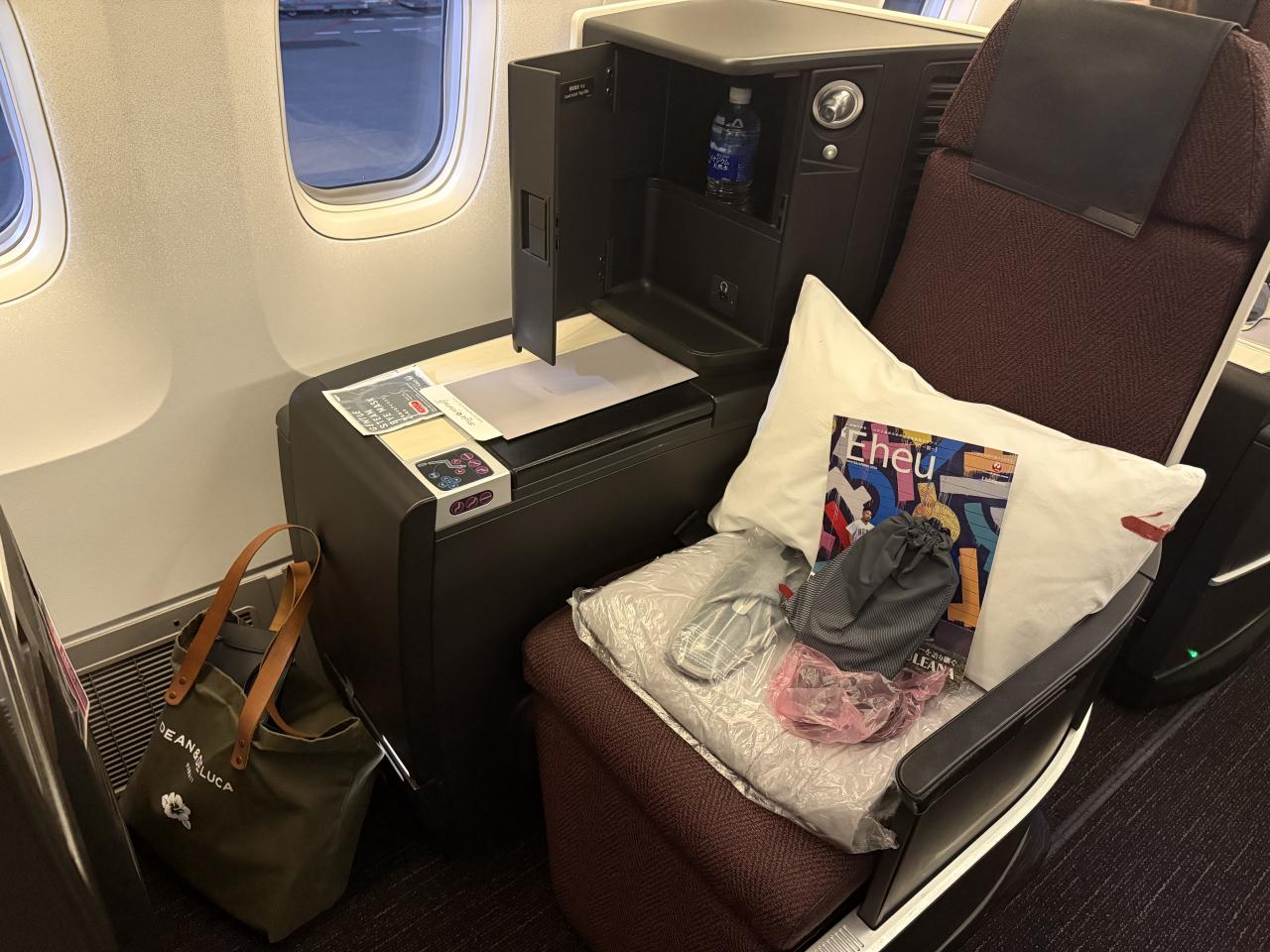 娘と夫は機内でもステーキを食べ始めたけど、私はフラットにしてすぐ寝まーす。