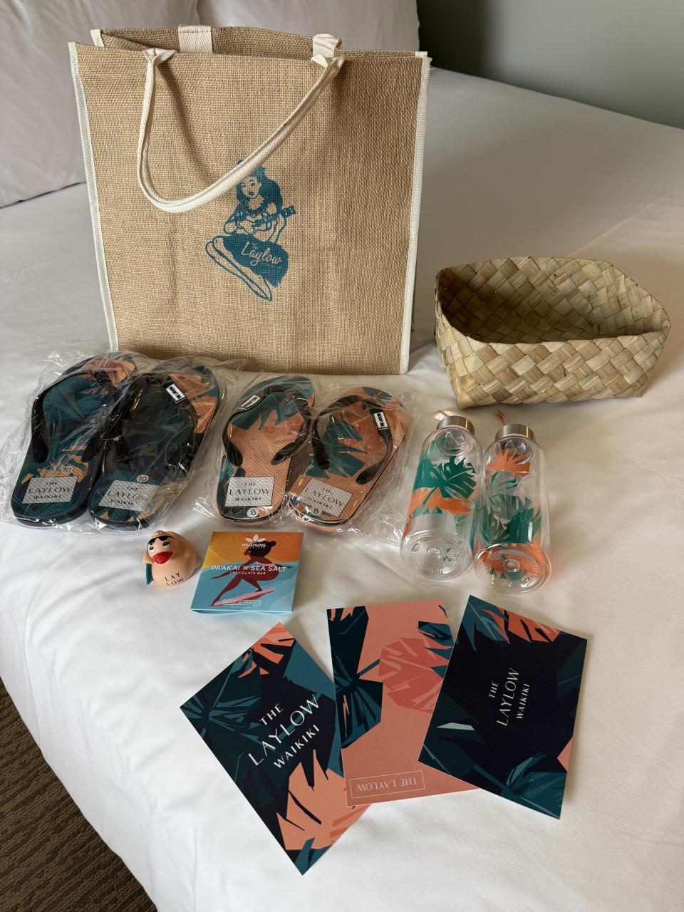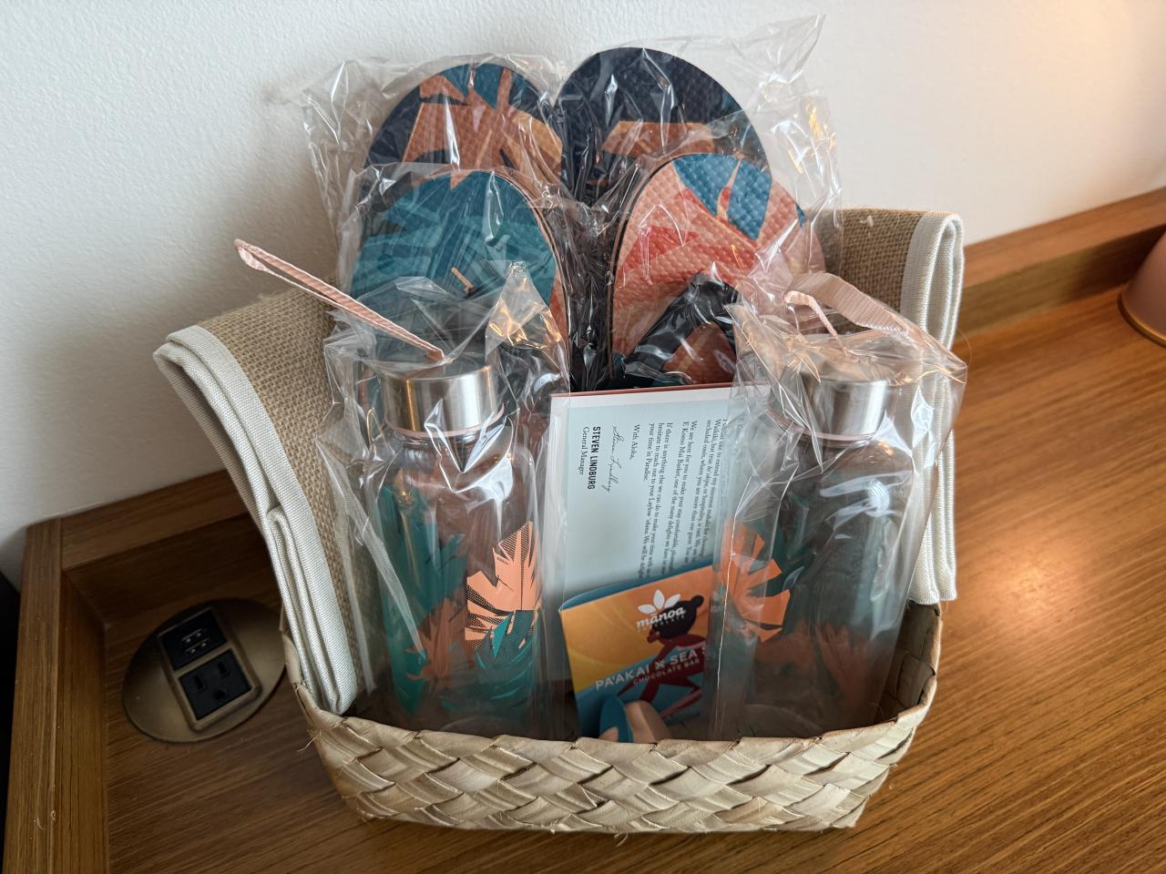 プールバッグ(滞在中めっちゃ活用した!)、ビーチサンダル(夫がいらないというので、サイズを変更してもらって娘とお揃いに♪)、水筒、マノアチョコレート、ハガキ、あひるちゃん。小さいバスケットにこんなに入ってました。