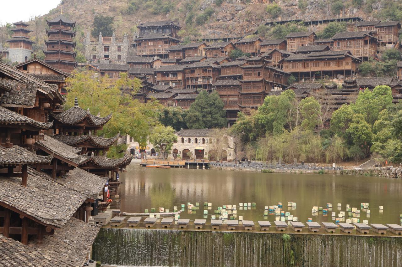 ブイ族の伝統的な建築物や塔が建てられて街が再現されています。