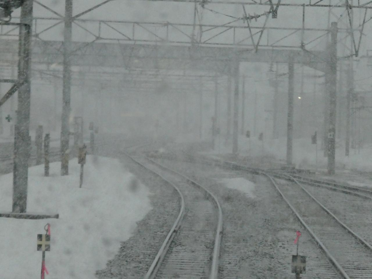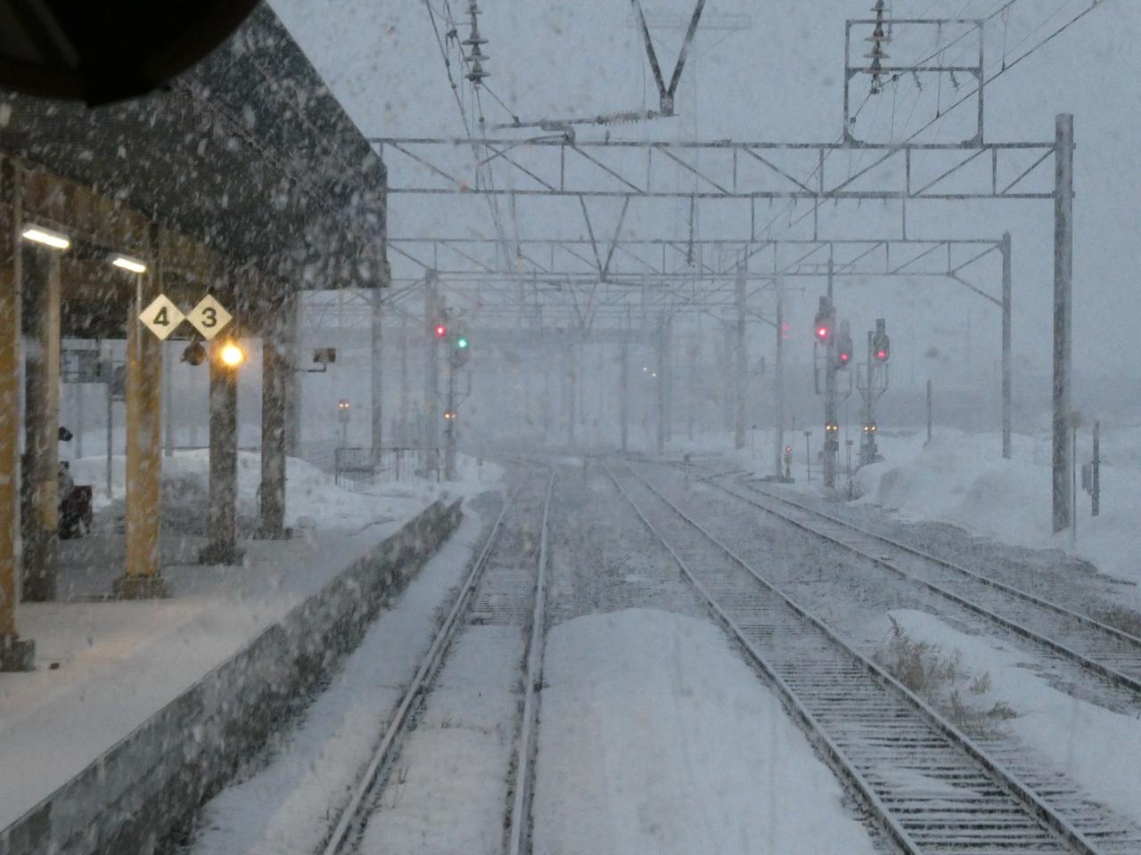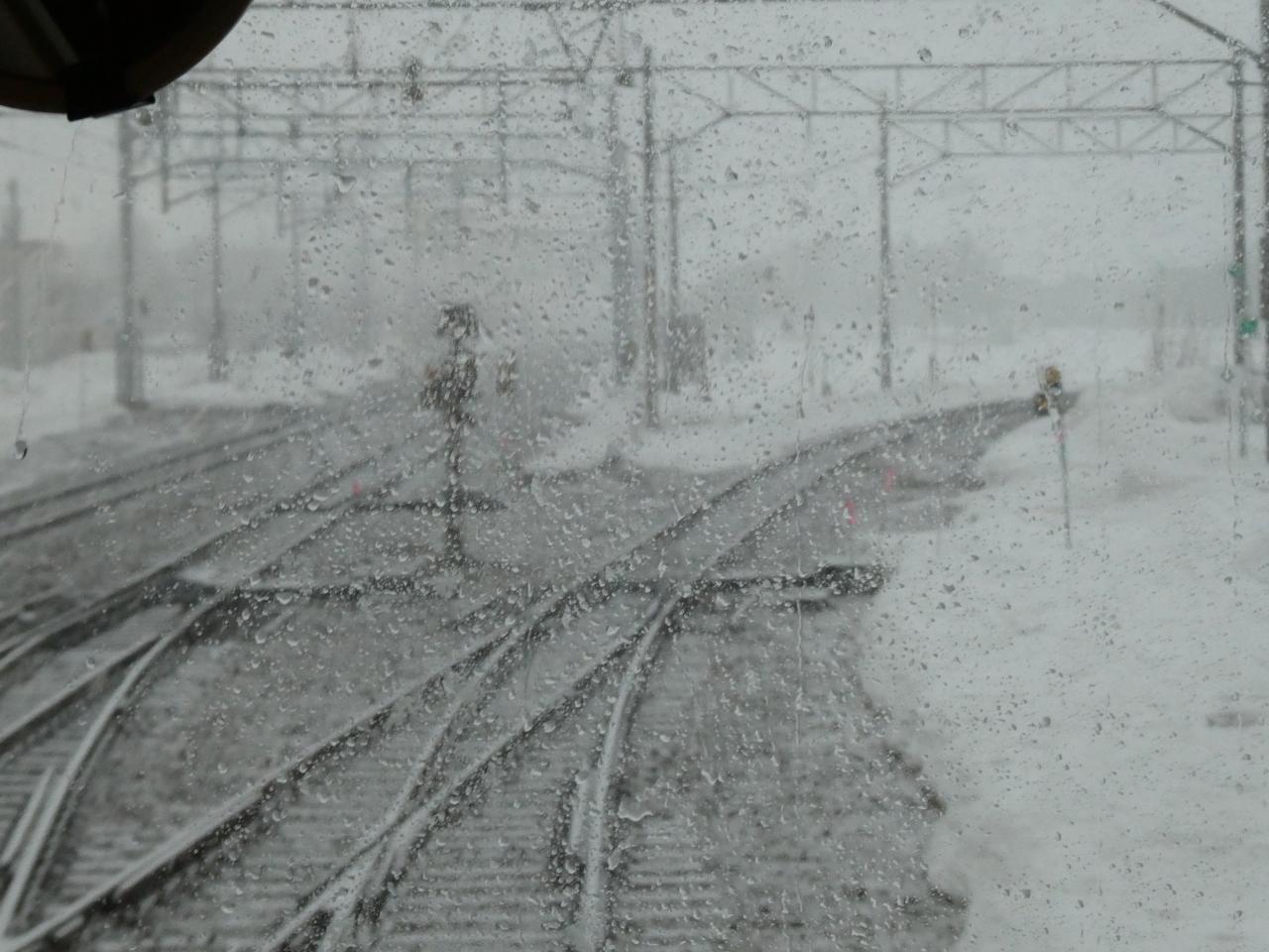 前方は雪でほとんど見えず、途中駅もそこそこのスピードで駆け抜けるので途中の写真はありません。 -