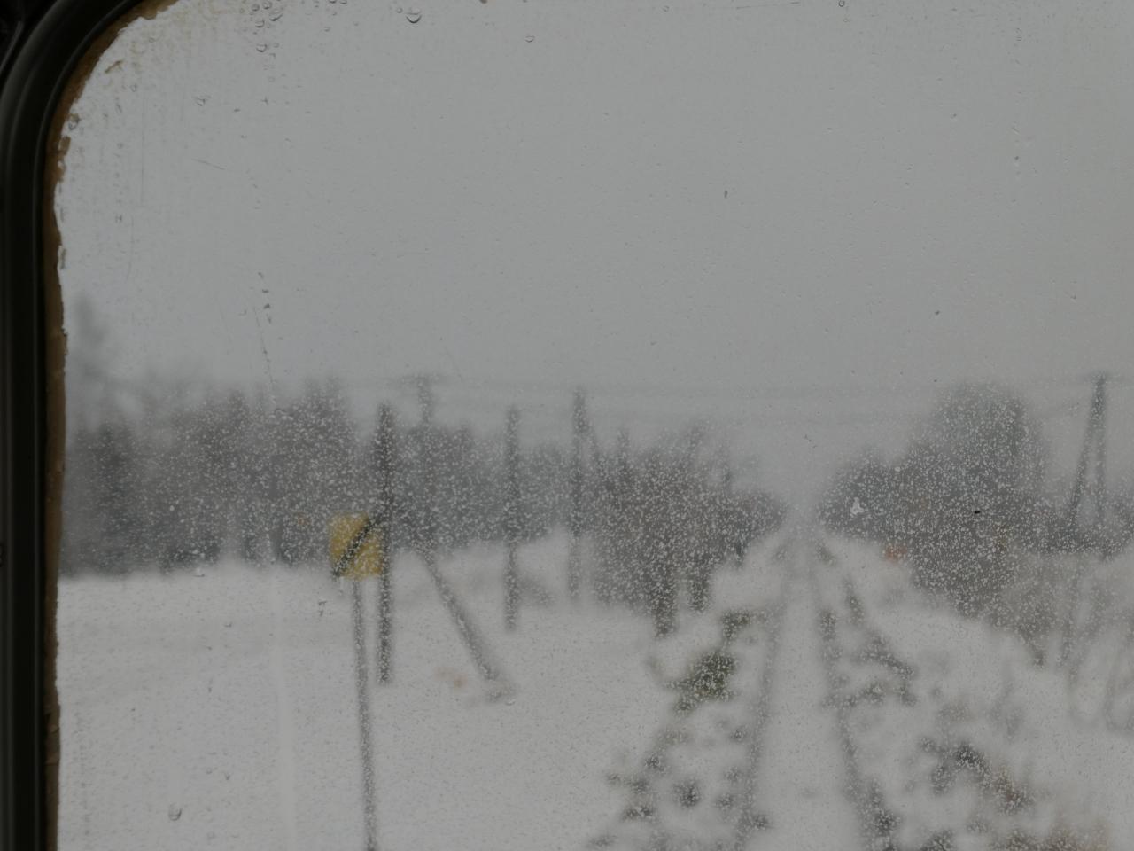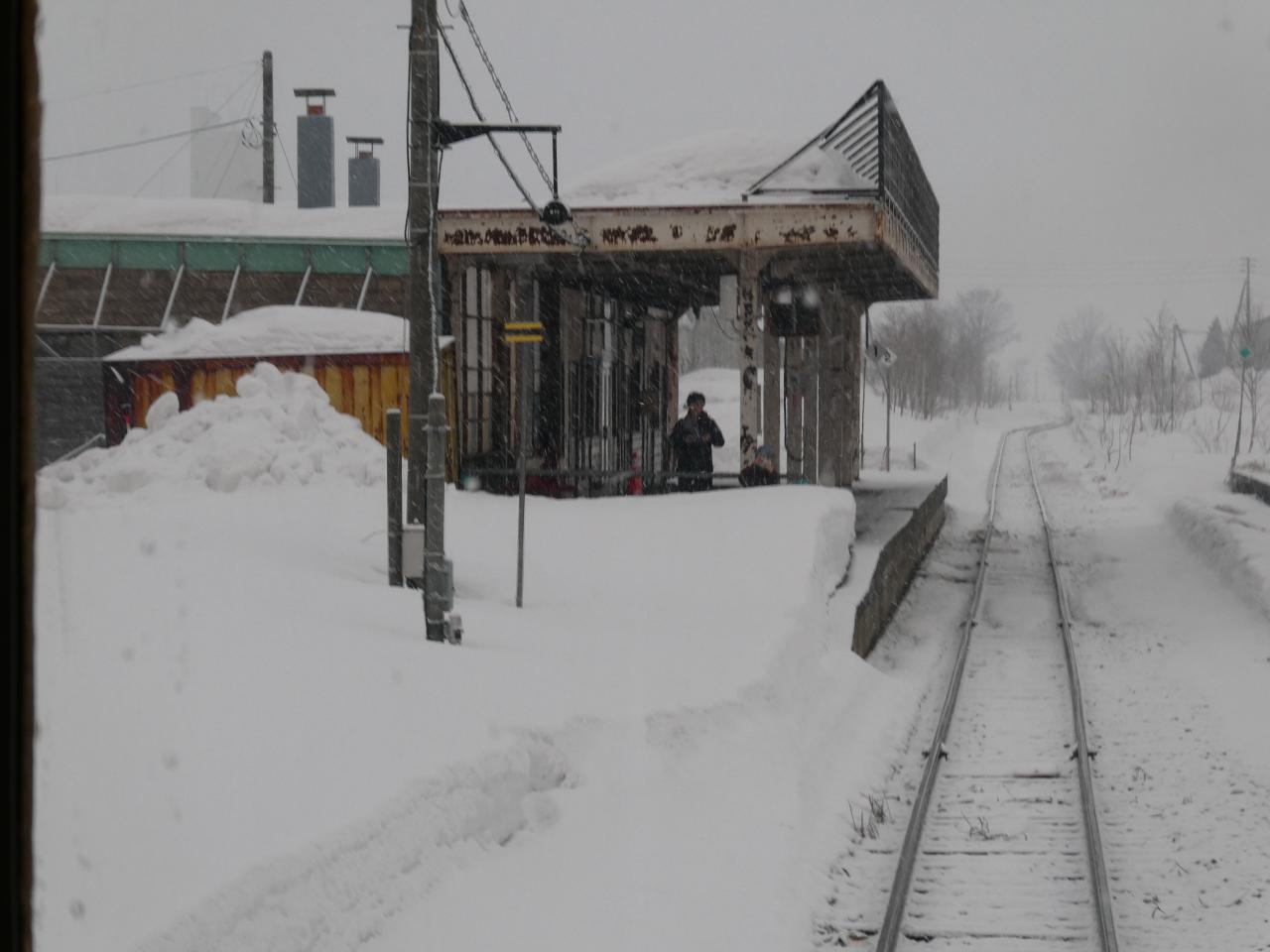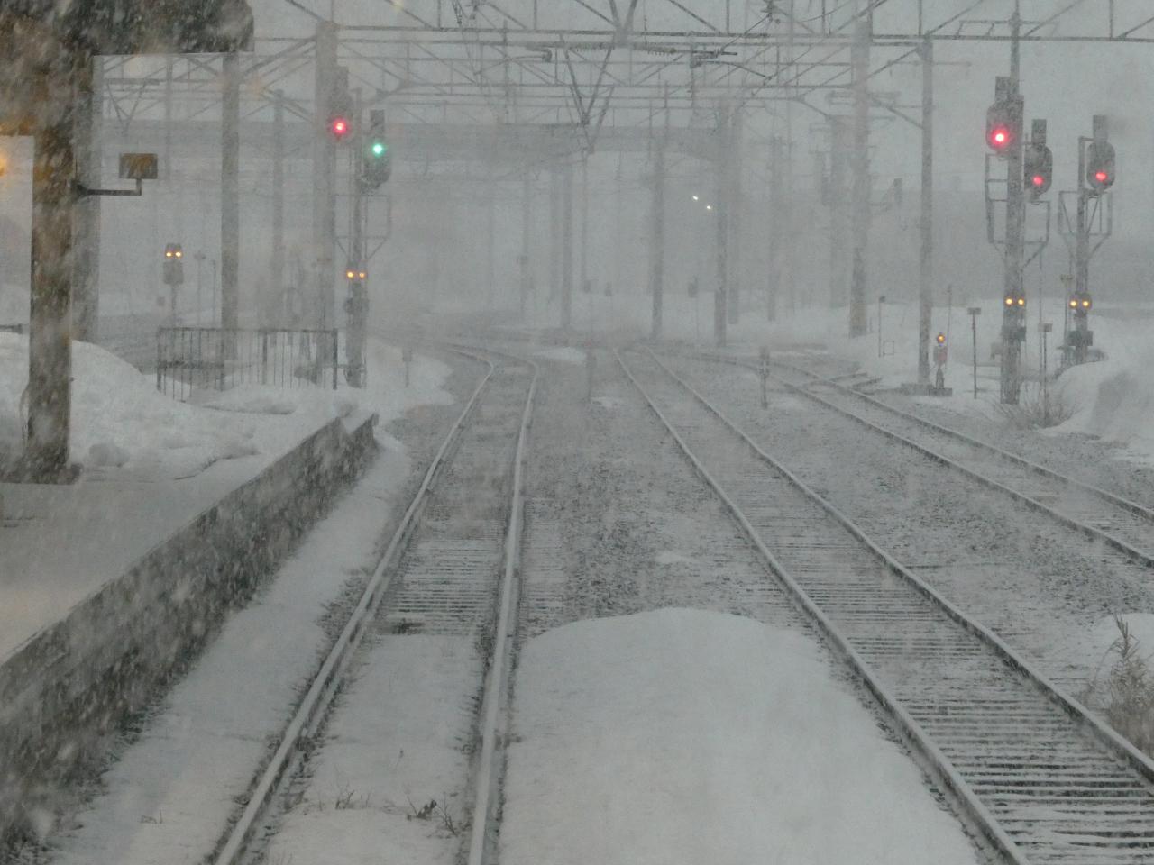 前方は雪でほとんど見えず、途中駅もそこそこのスピードで駆け抜けるので途中の写真はありません。 -