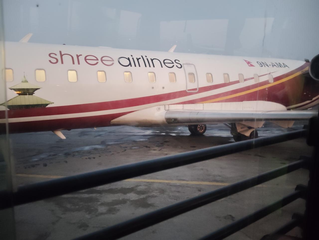 Shree airlinesの機体。たまたまバスの出口近くに座っていた私が最初に搭乗しました。複数の航空会社がこの遊覧飛行を催行しています。