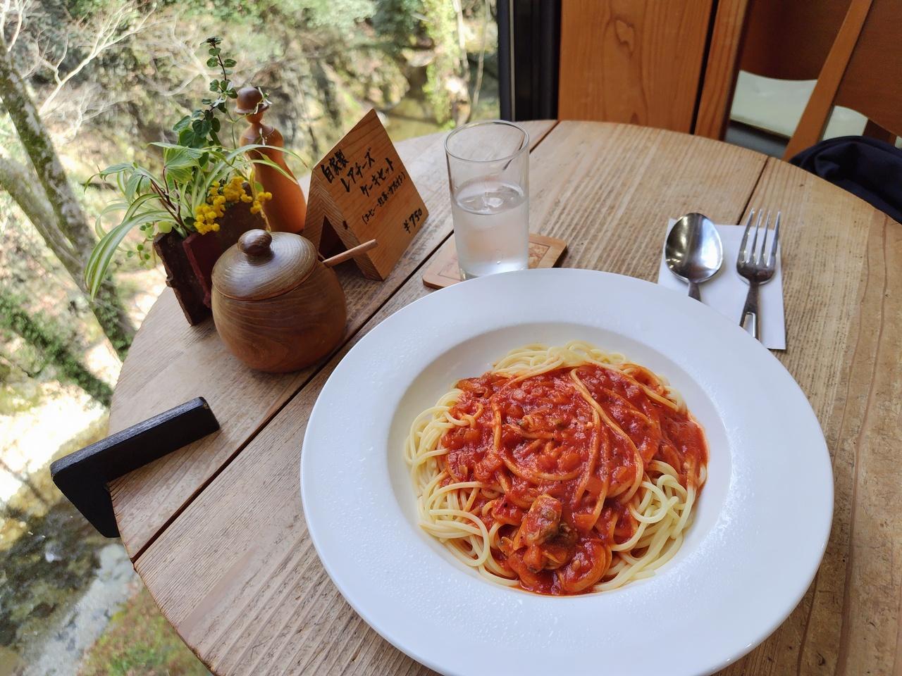 パスタとカフェオレのセットで1100円。
