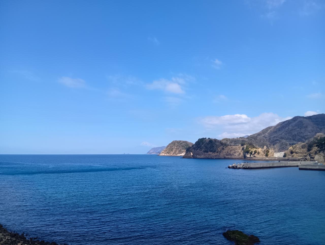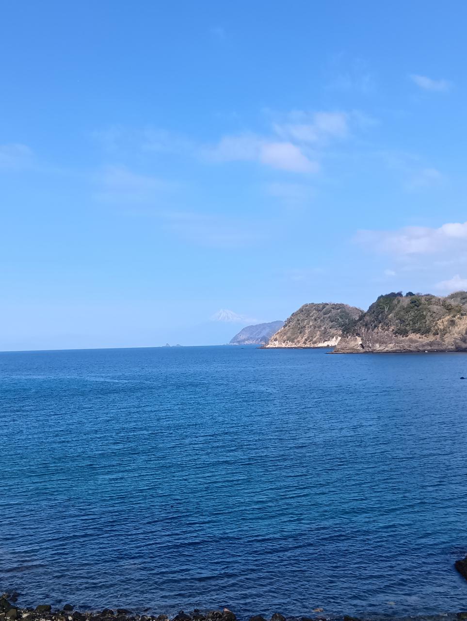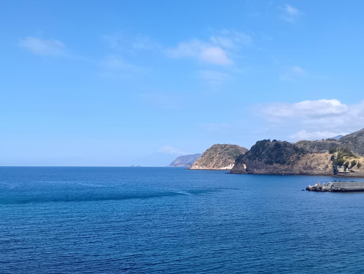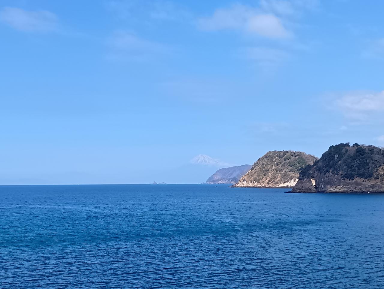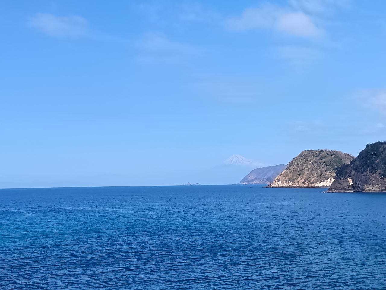 少しズームアップします。海岸線の先端の左側、写真ほぼ中央に富士山が見えます!伊豆半島のだいぶ南に下っても富士山が見えるスポットがあるのですね!