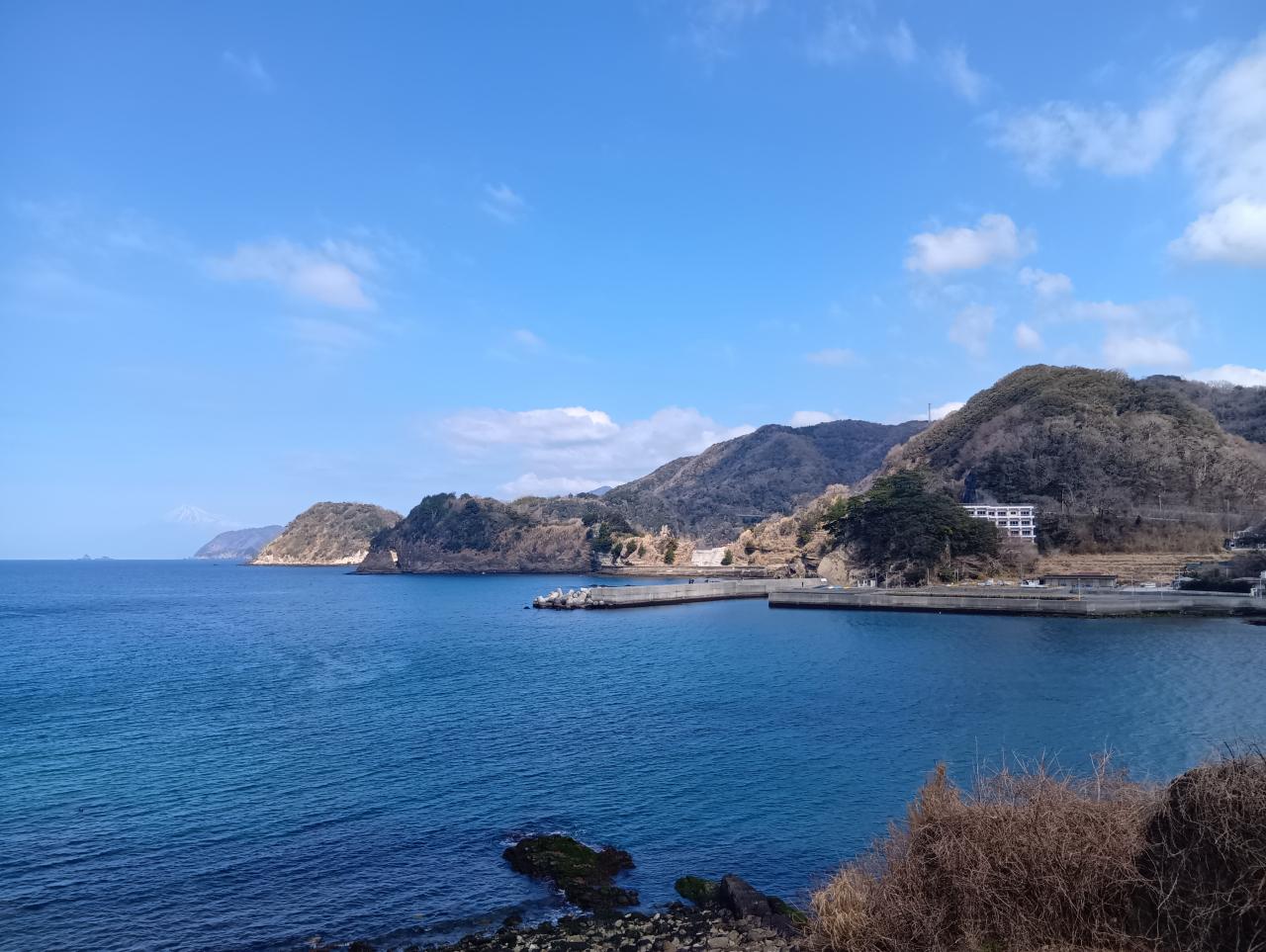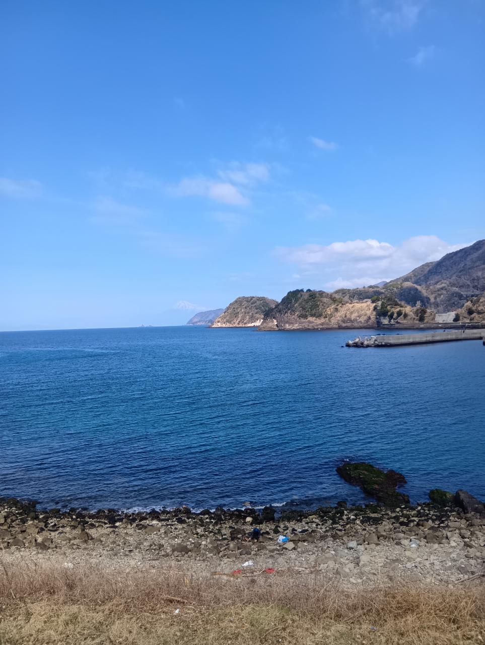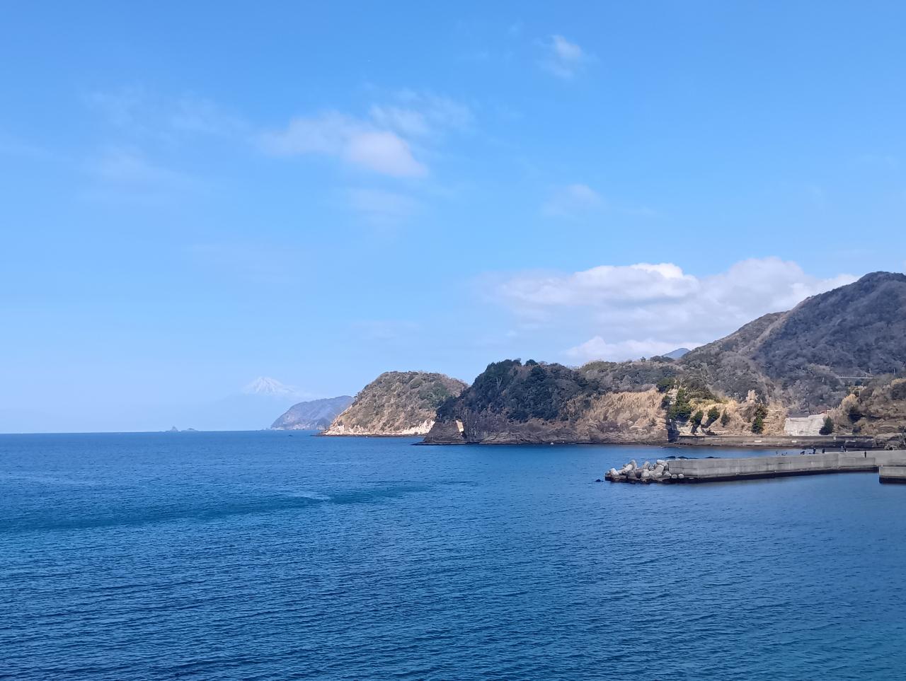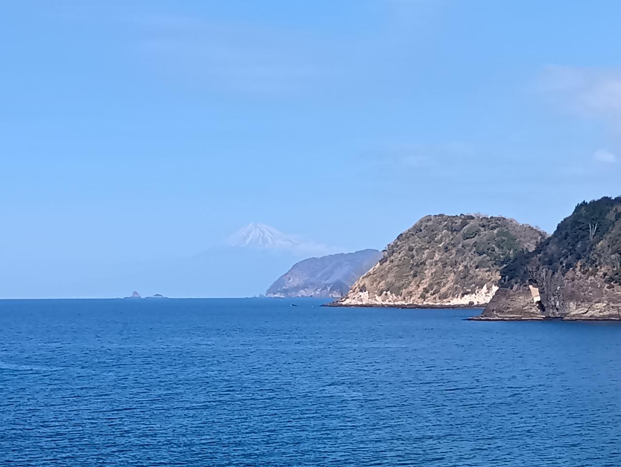 少しズームアップします。海岸線の先端の左側、写真ほぼ中央に富士山が見えます!伊豆半島のだいぶ南に下っても富士山が見えるスポットがあるのですね!