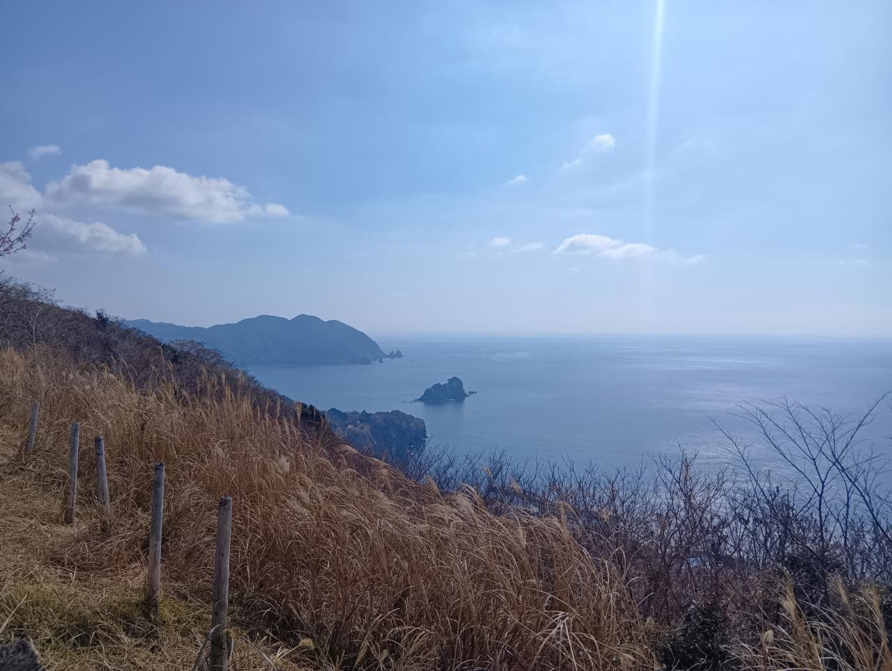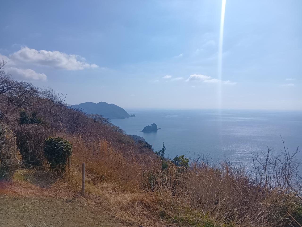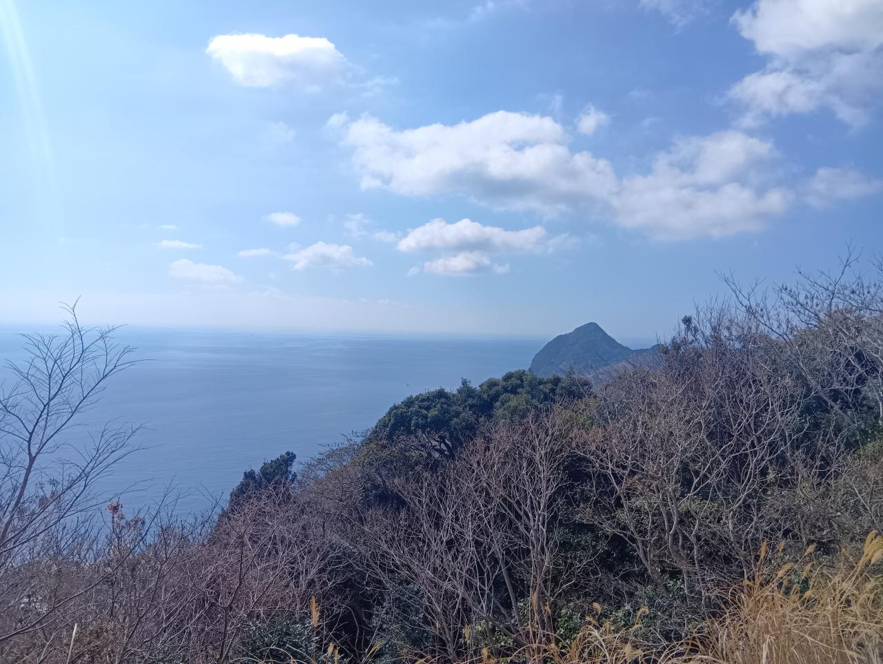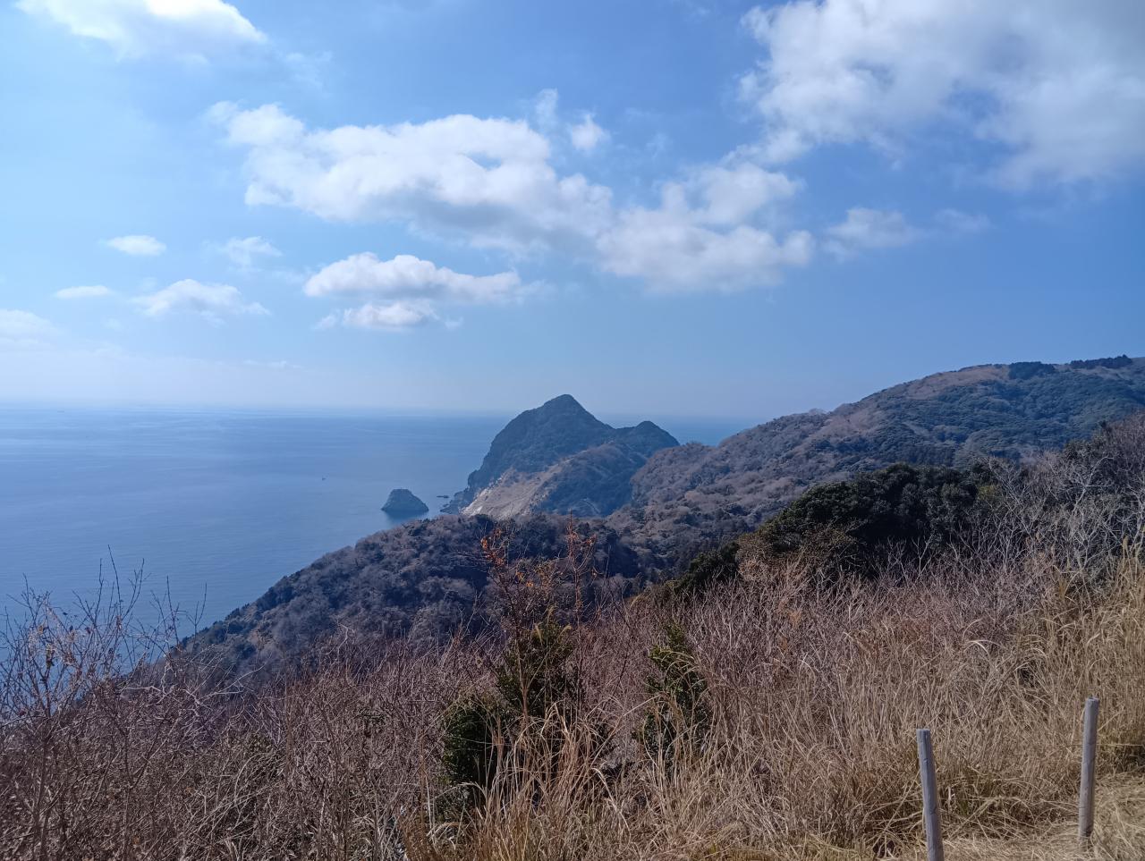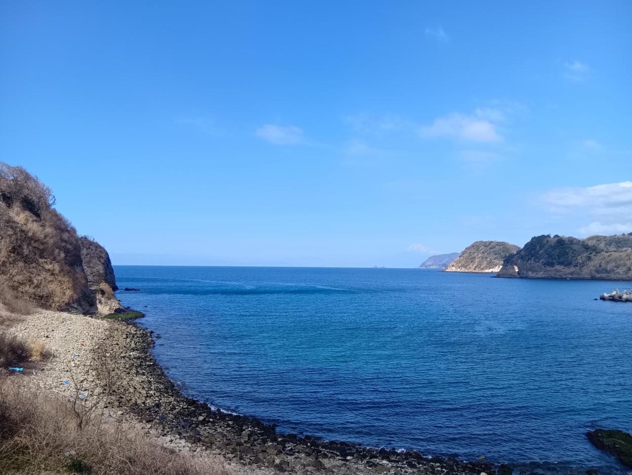少しズームアップします。海岸線の先端の左側、写真ほぼ中央に富士山が見えます!伊豆半島のだいぶ南に下っても富士山が見えるスポットがあるのですね!