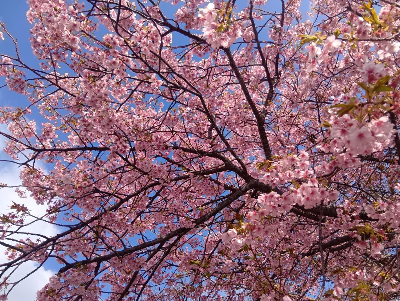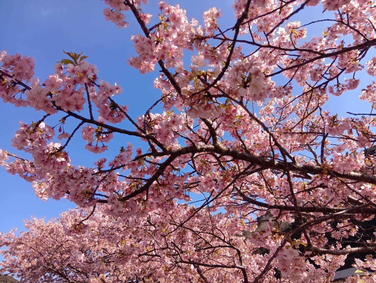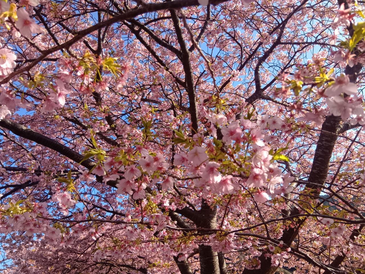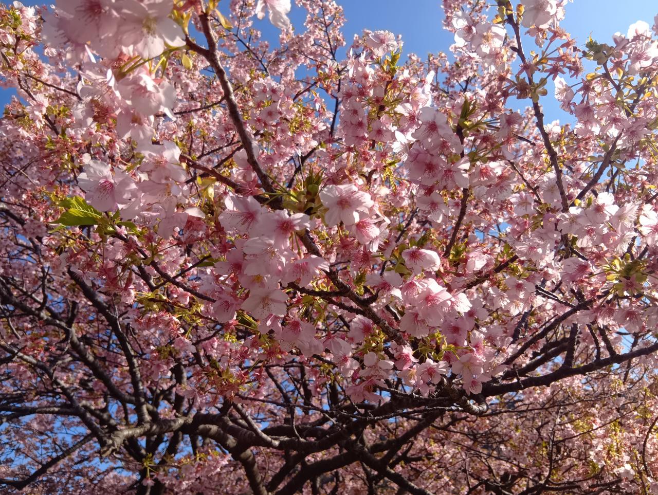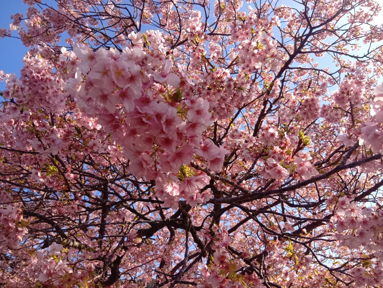 下から見る満開の河津桜!バックの青空で艶やかなピンク色で絶句するほど美しい光景です!