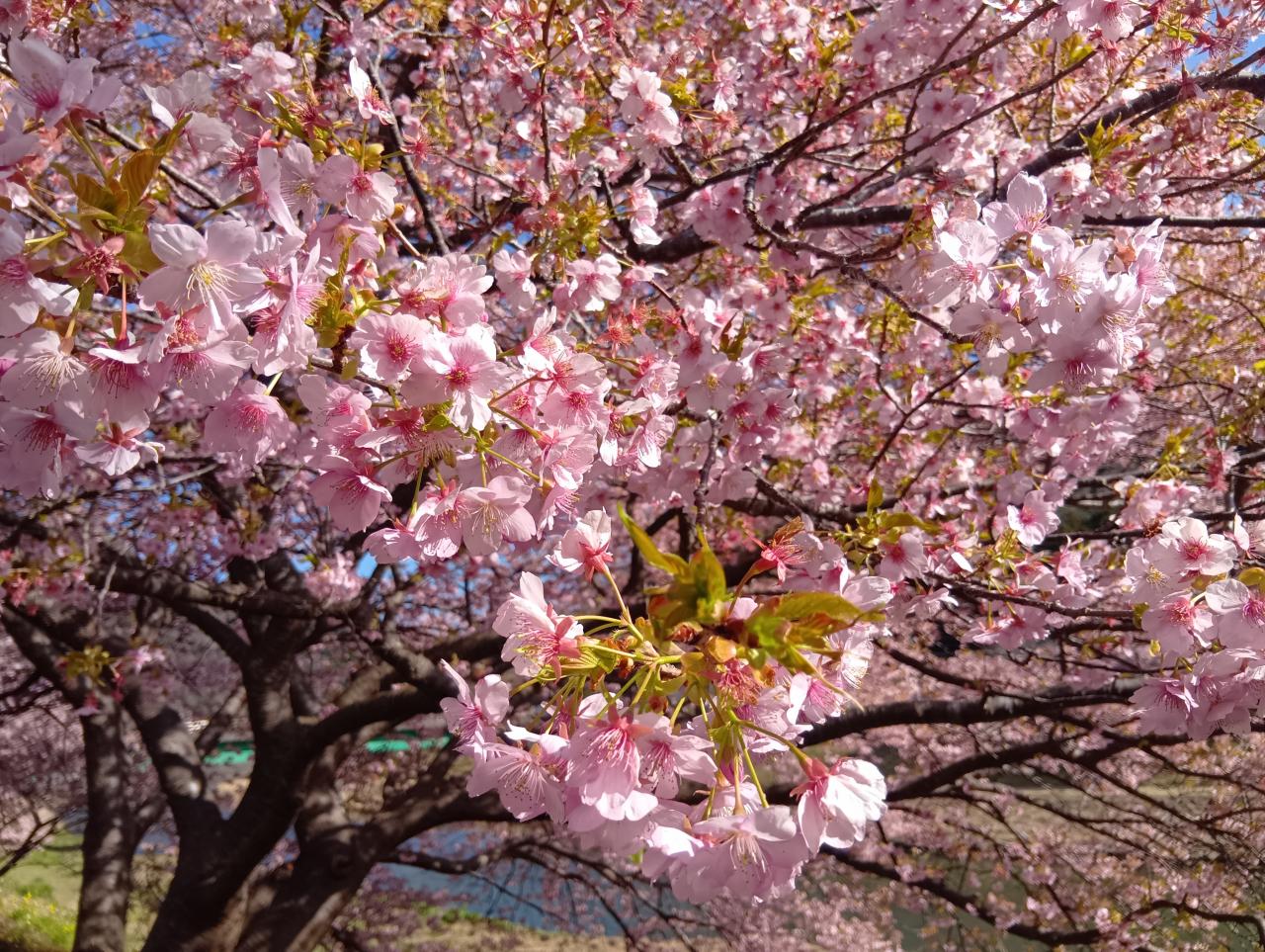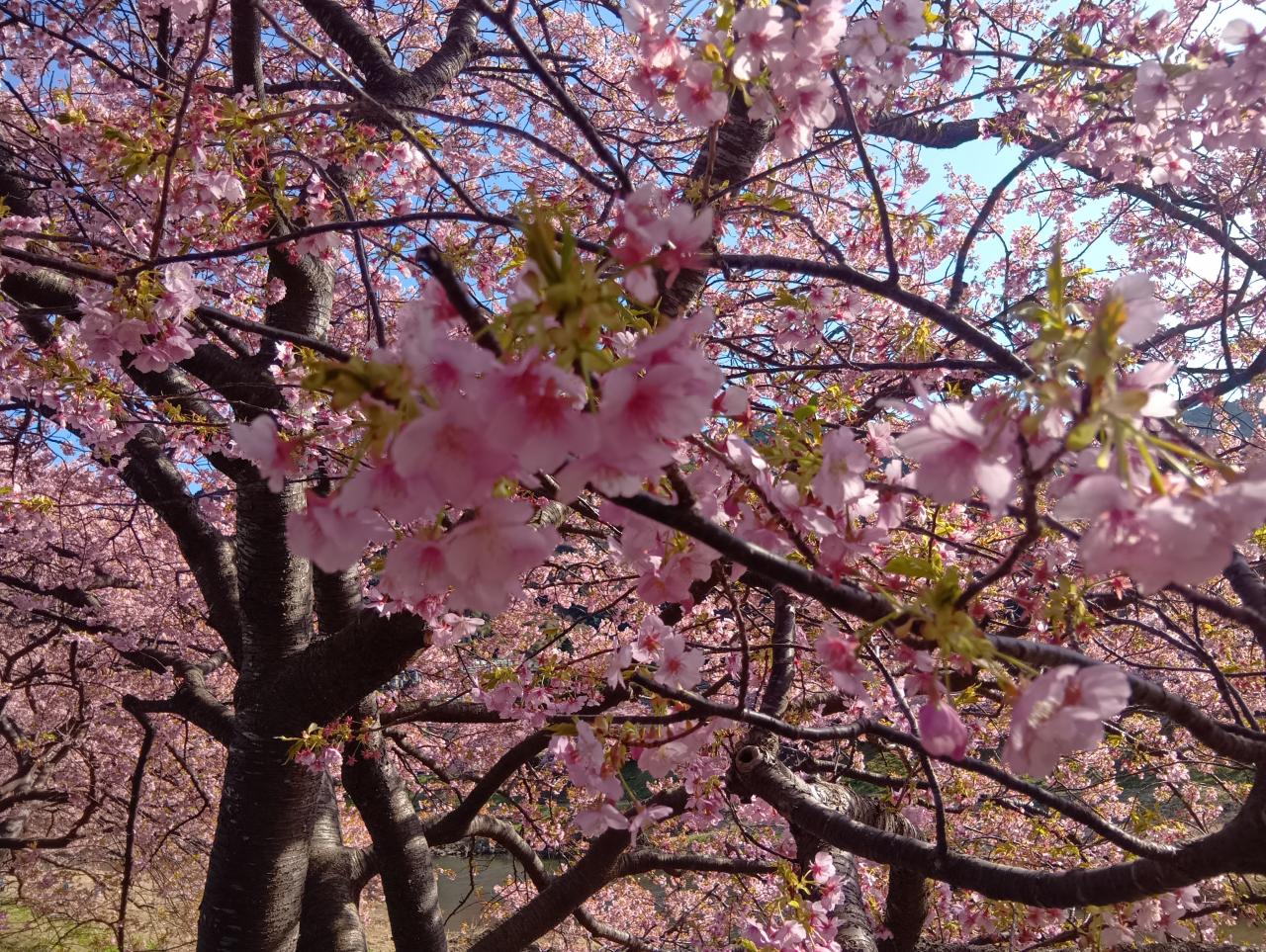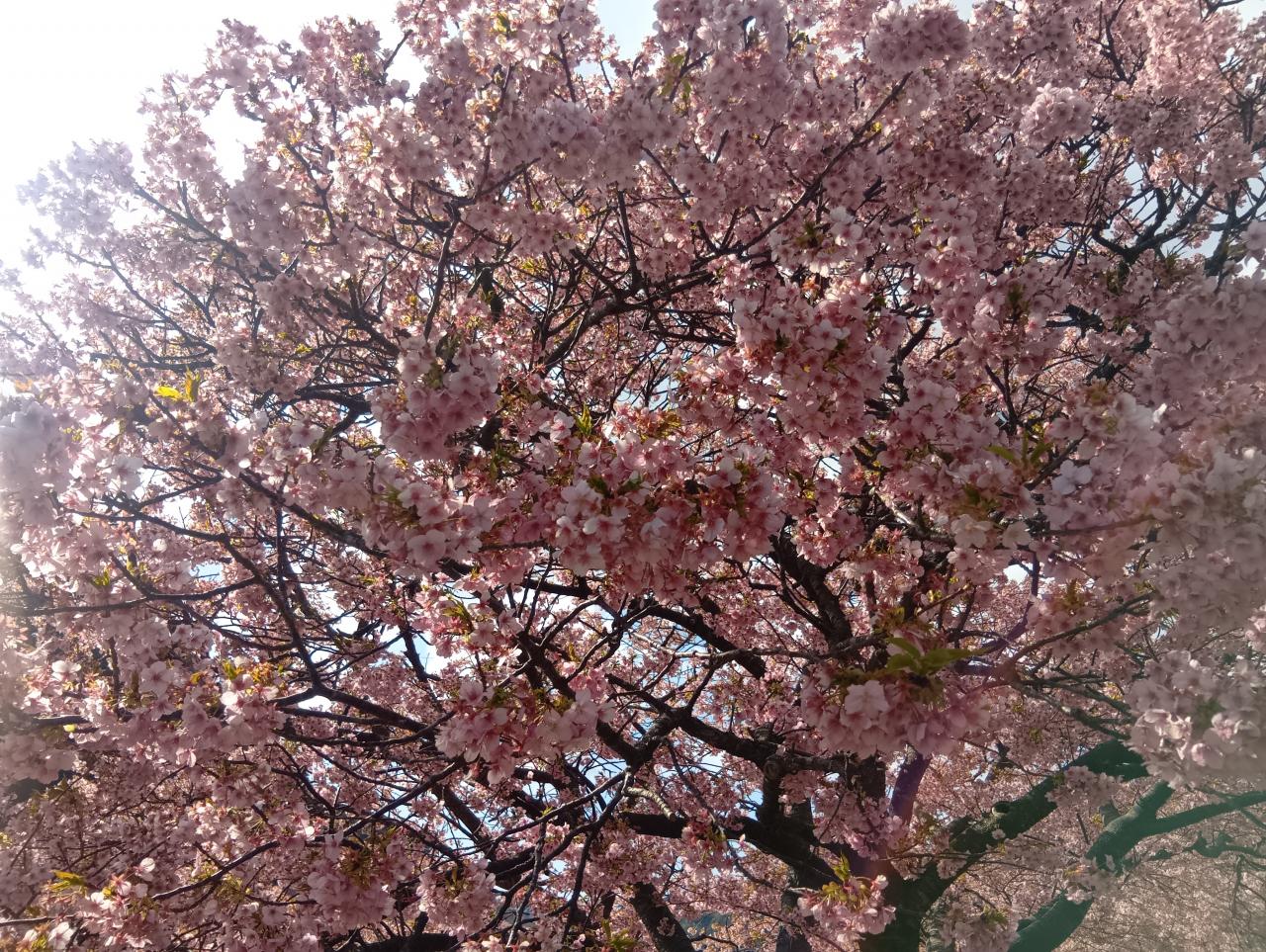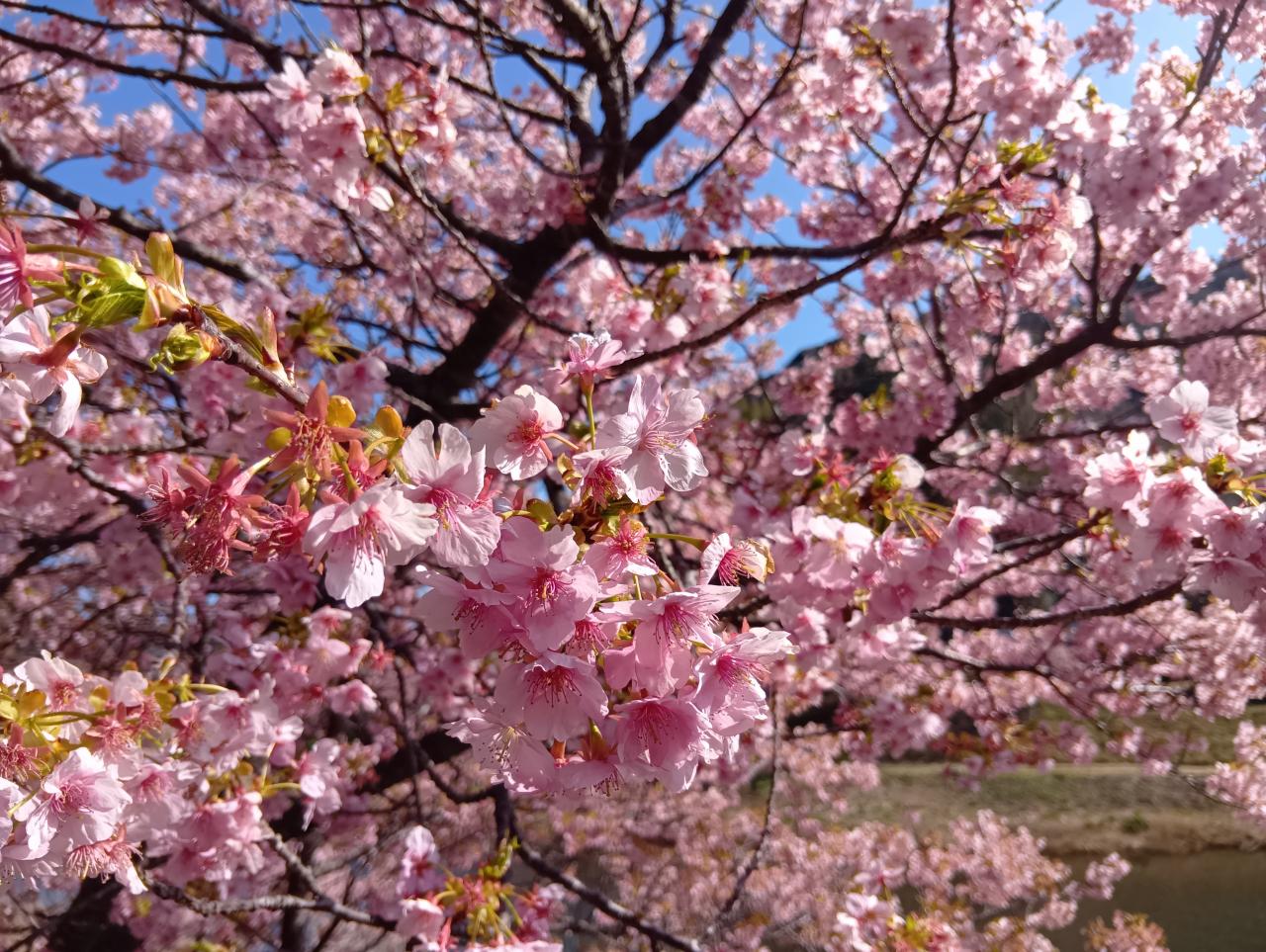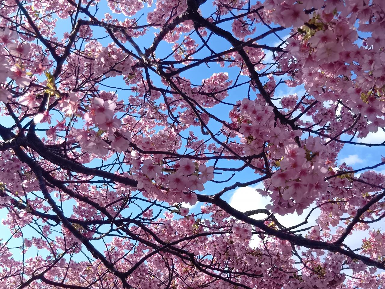 下から見る満開の河津桜!バックの青空で艶やかなピンク色で絶句するほど美しい光景です!