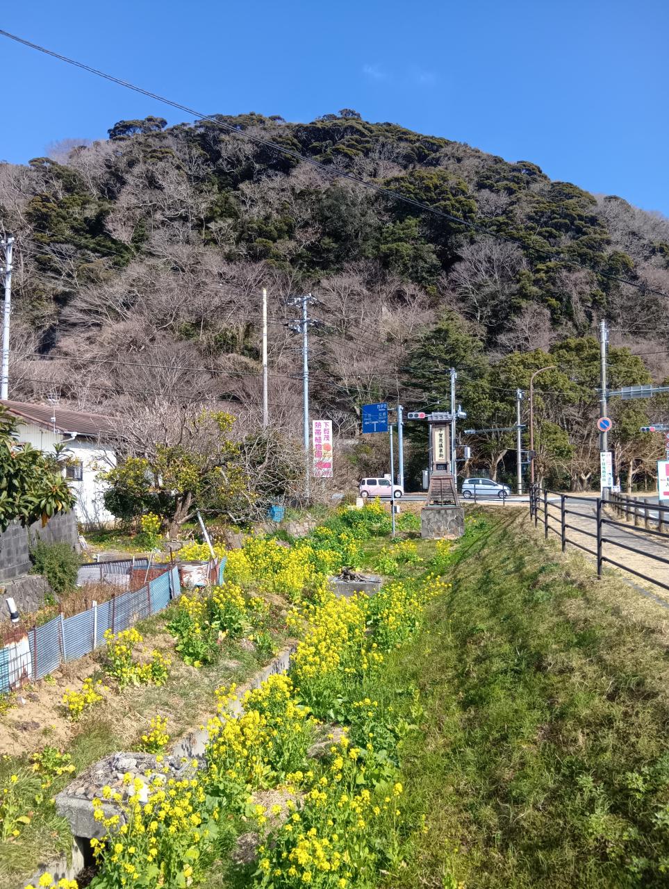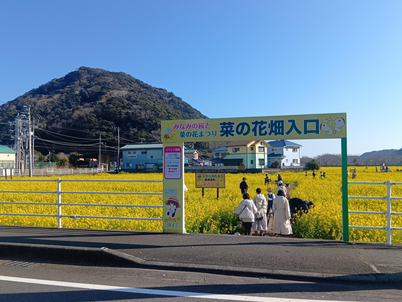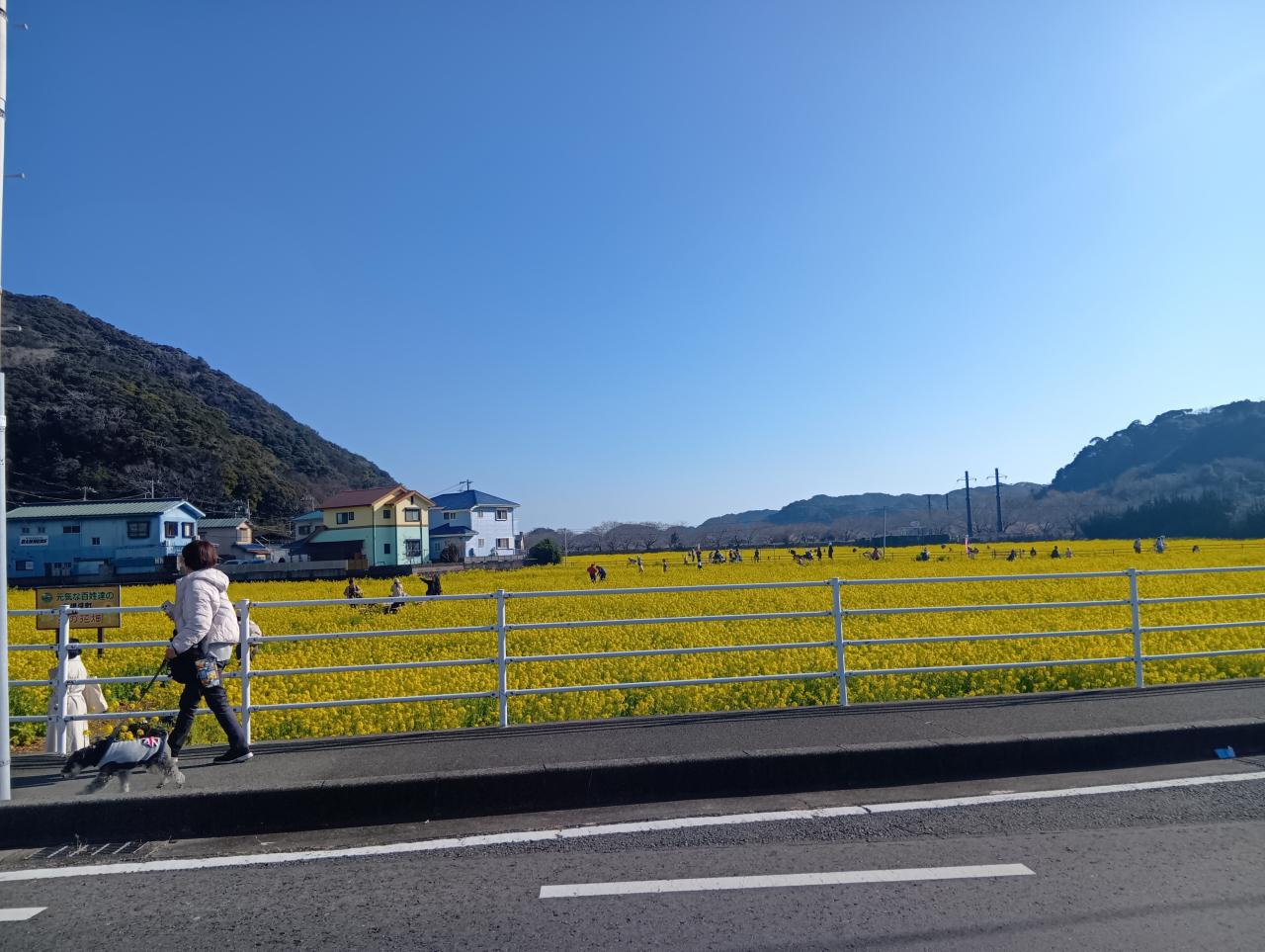 国道136号線を東へ走ります。下賀茂から数キロ走ると、石廊崎から繋がる県道のT字路の角にある日野菜の花畑が現れます。河津桜同様、この菜の花畑も有名な広大な菜の花畑です。