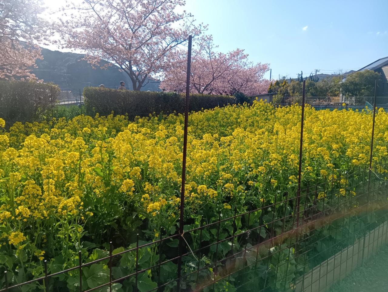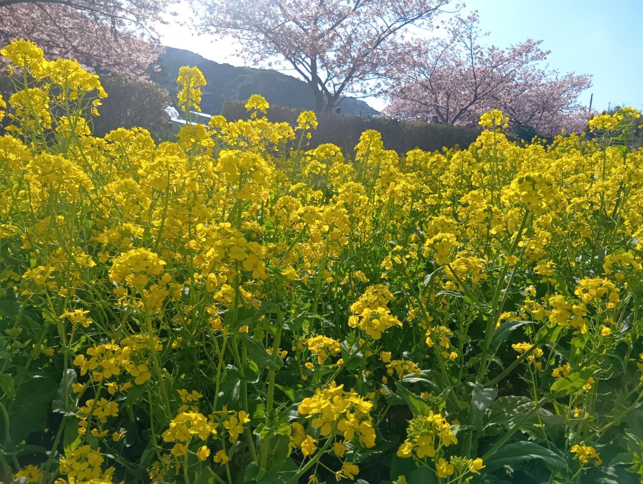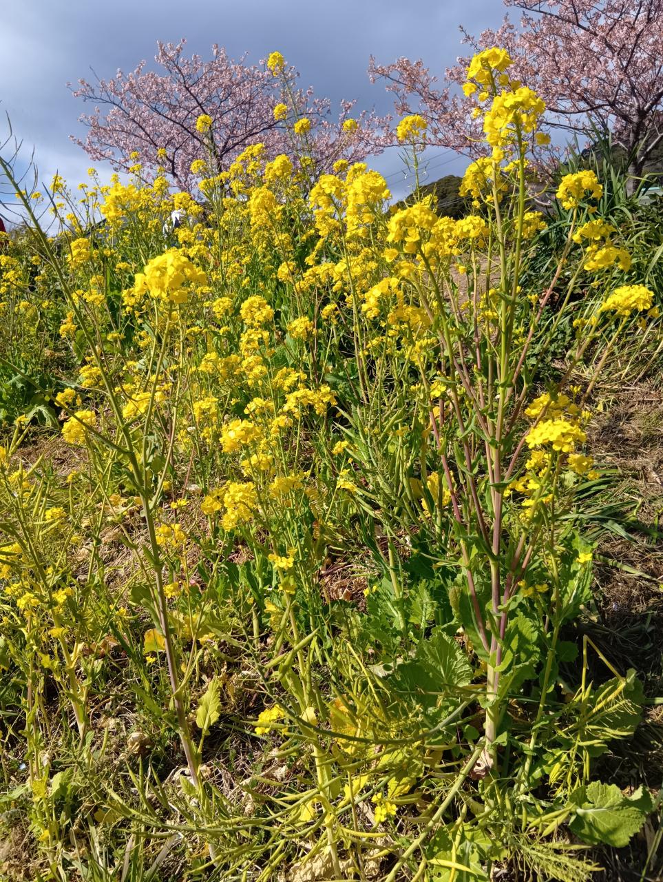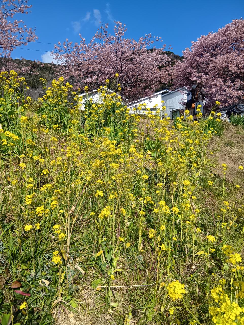 駐車場近くの遊歩道に戻りましたので、遊歩道から外れます。満開の艶やかなピンク色の河津桜並木を見て大満足でした!遊歩道傍にもこのような菜の花群が見られます。