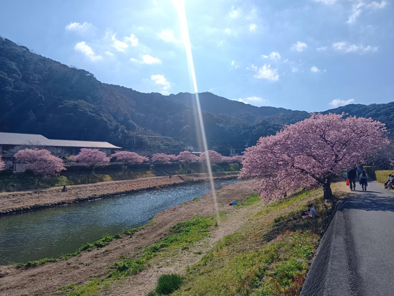 河津桜並木を歩きます。日の当たり方により、濃いピンク色で絵のような美しさです!