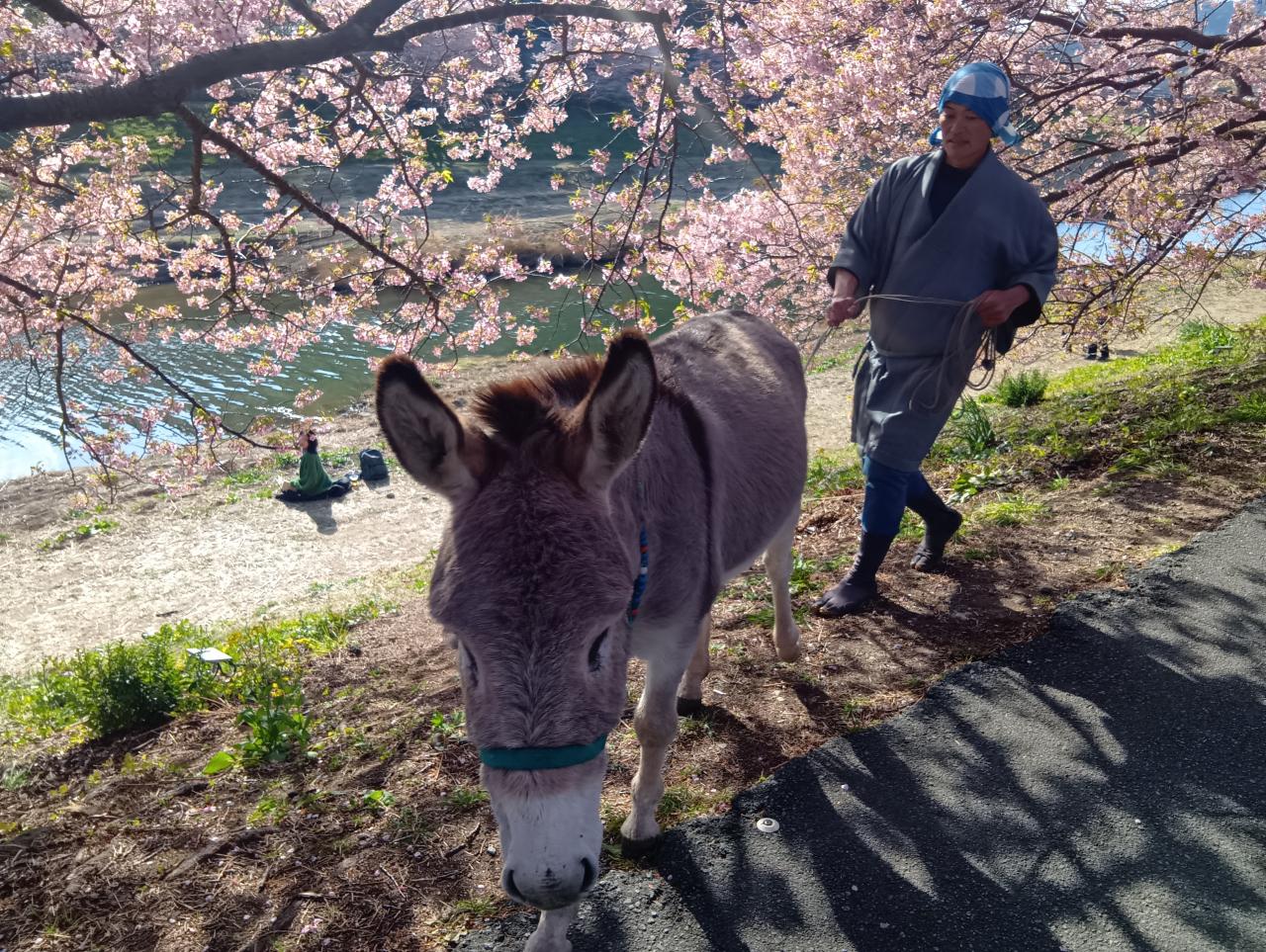 橋を往復した後、川沿いに下ります。何という美しい桜並木の光景でしょうか!芝も一層美しさを見出しています!