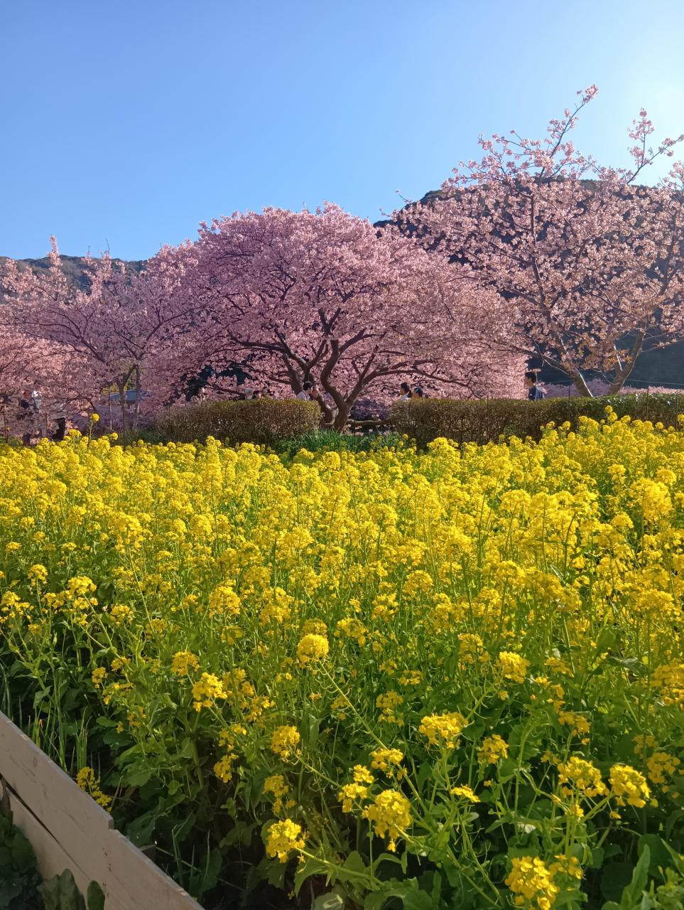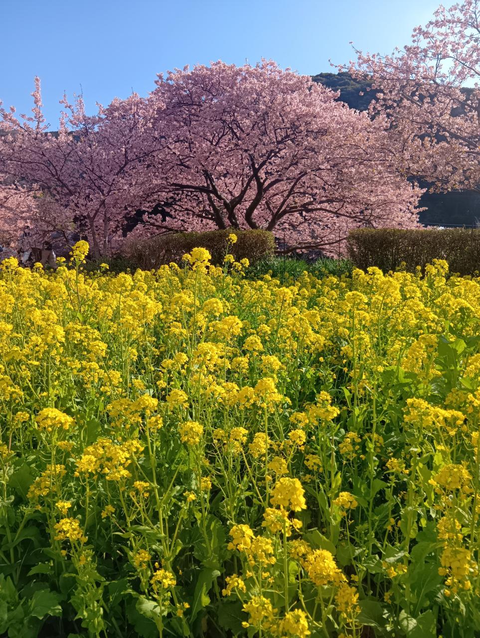 縦にすると遊歩道沿いの河津桜とのツーショットが映ります。日の当たりが最高で真っ黄色の菜の花とピンク色の桜のコラボ、絵の世界のような美しい光家です!驚嘆します!