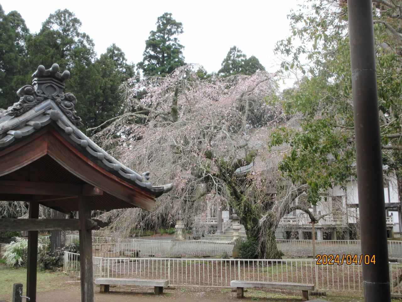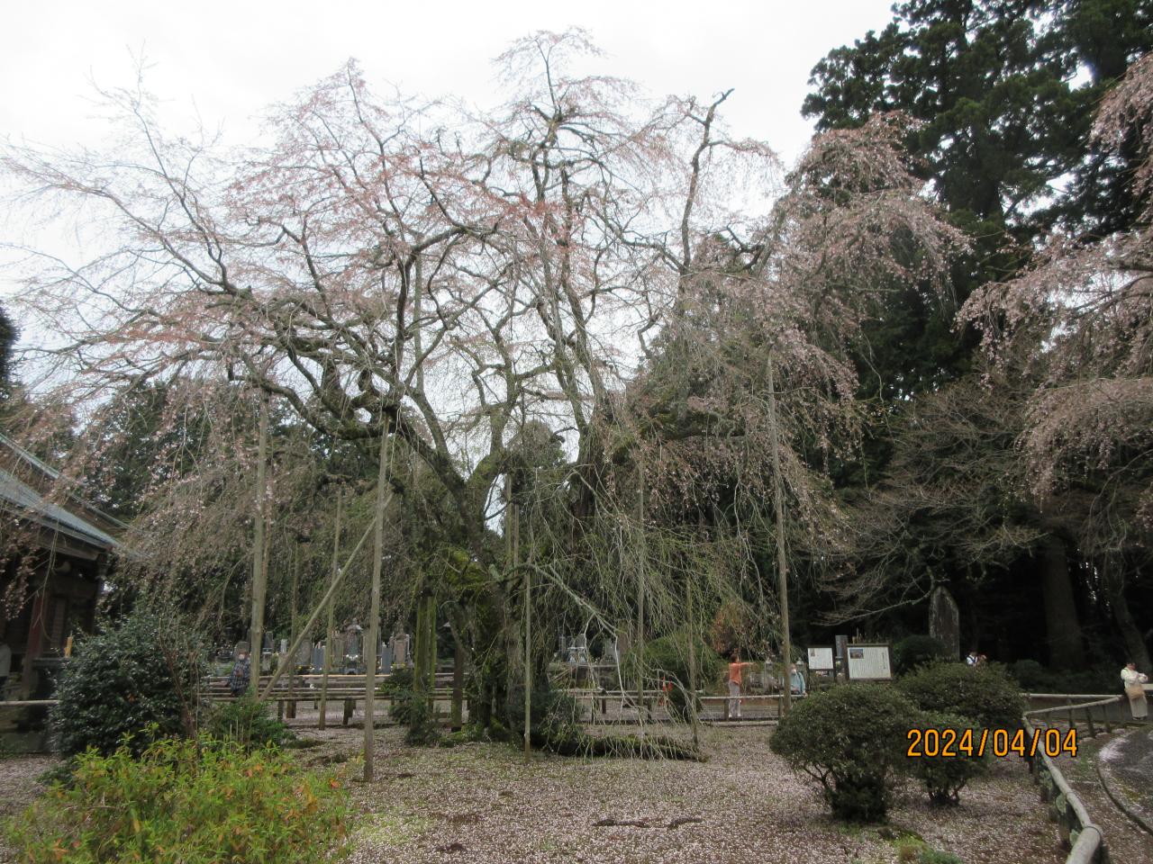 <2025年4月9日、千葉県多古町(たこまち)唐竹にある竹林山 妙光寺(ちくりんざん みょうこうじ)の枝垂れ桜はツイテいないことに早々と散っていた。>