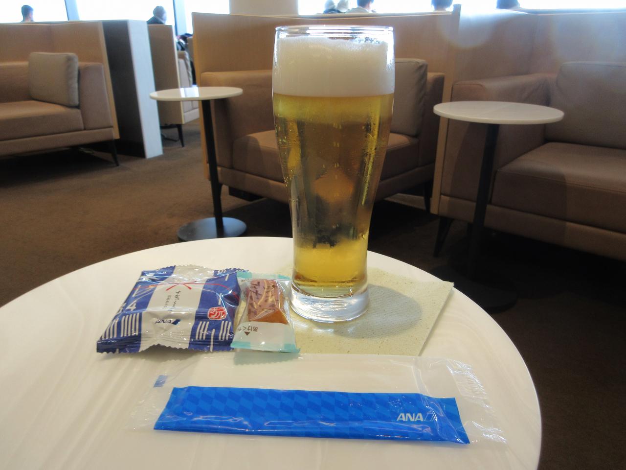 このラウンジはノンアルコールビールがありました。なので、私もおつまみとビール!もどき。