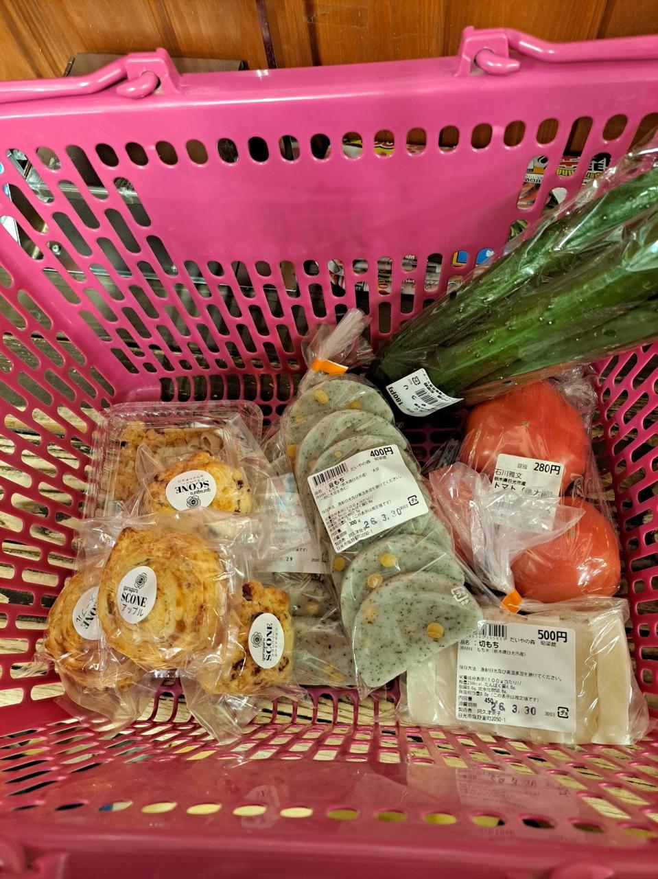 野菜、各種餅、スコーン、惣菜等(三千円強)を購入しました。