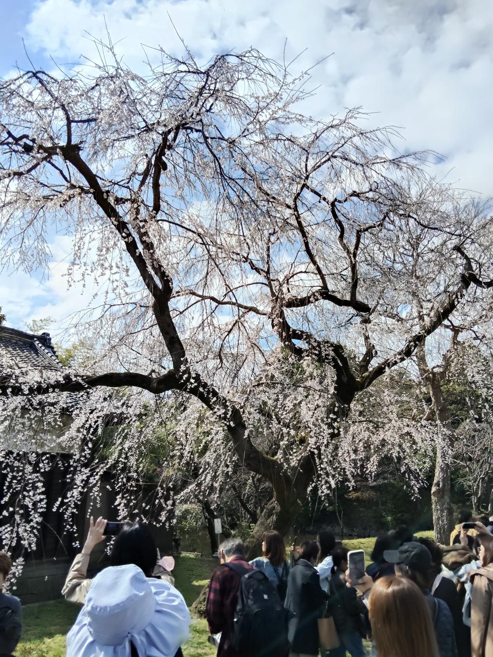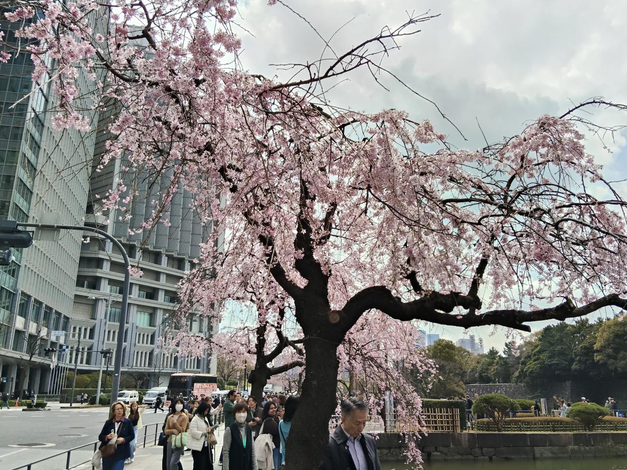 大手町あたり、お濠脇のしだれ桜。皇居をバックに写真を撮るひと、多数。 -