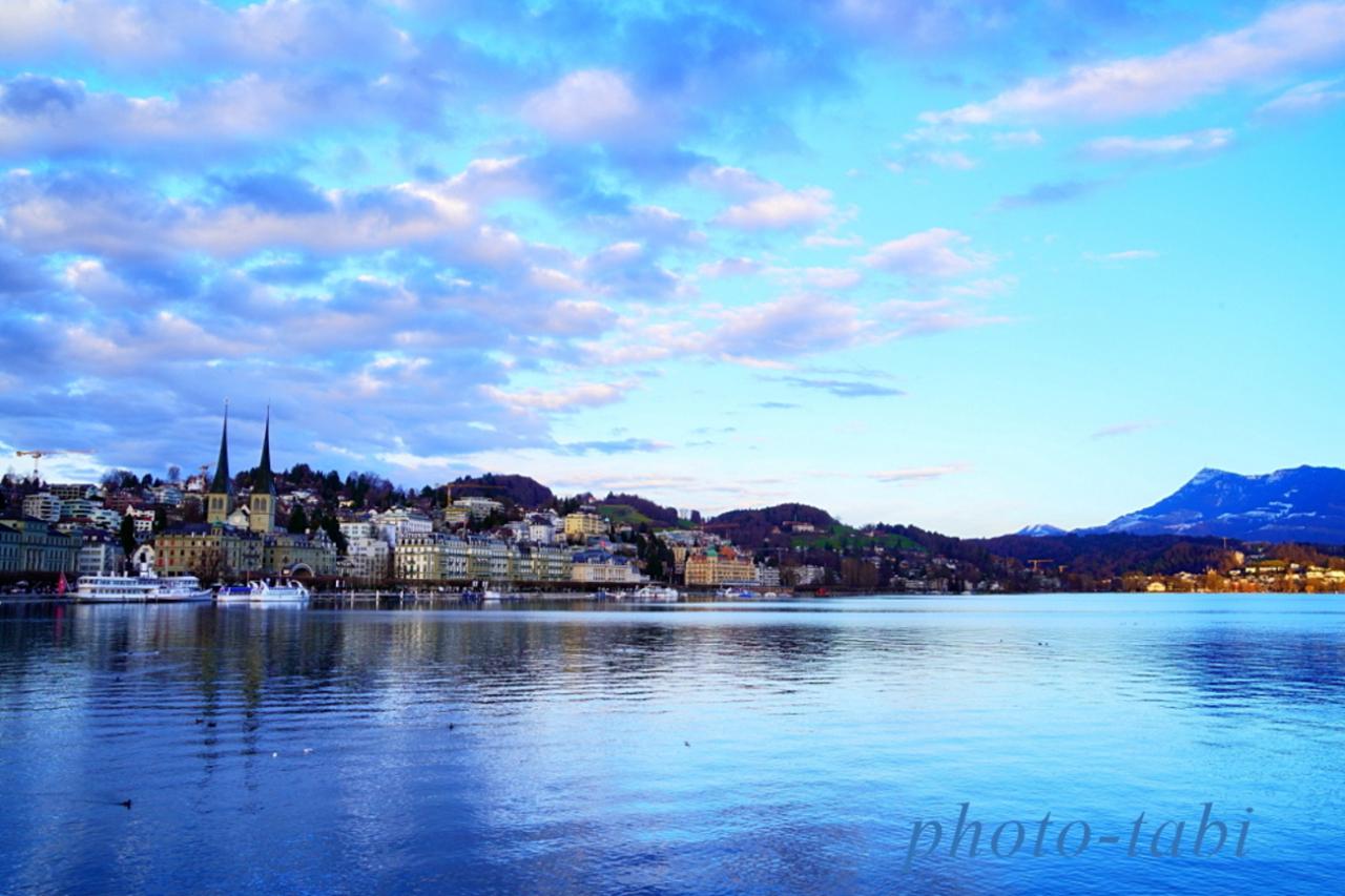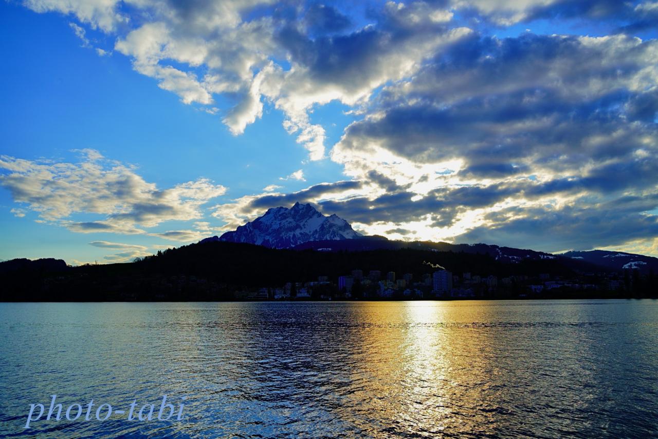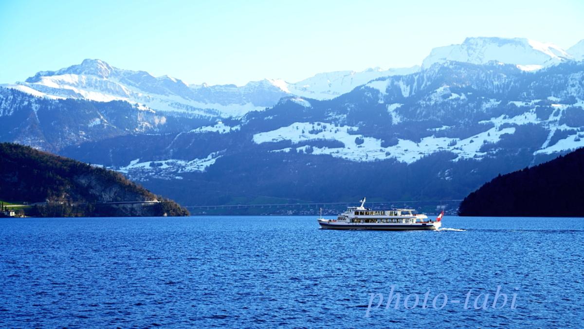 ルツェルンに到着し夕食を食べた後、ゼー橋の上から夕暮れの雪山とルツェルン湖に停泊するフェリーの写真を撮影