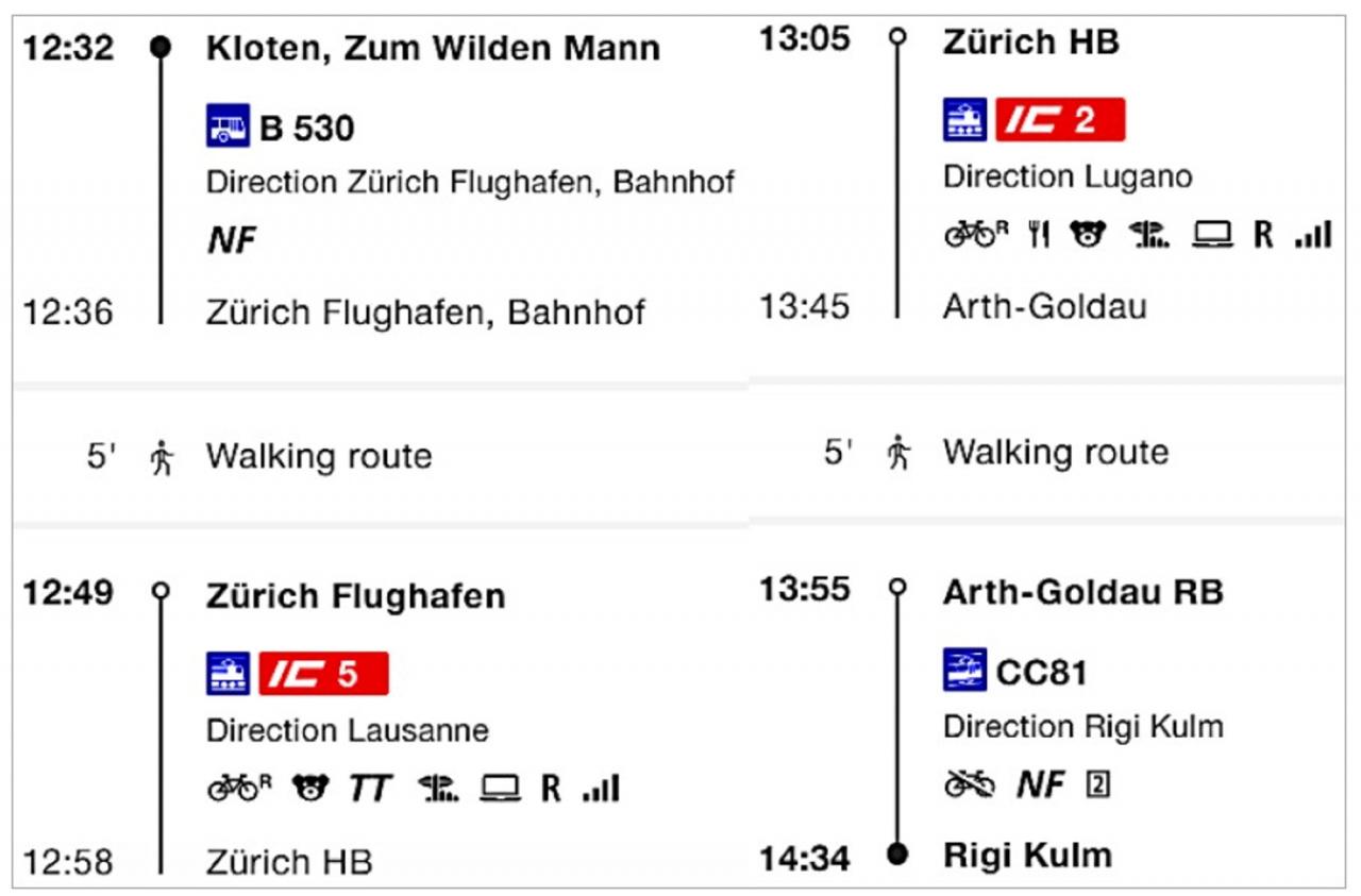 これはホテル最寄りのバス停からリギ山までの交通機関を検索したものです。(SBBのHPより) -