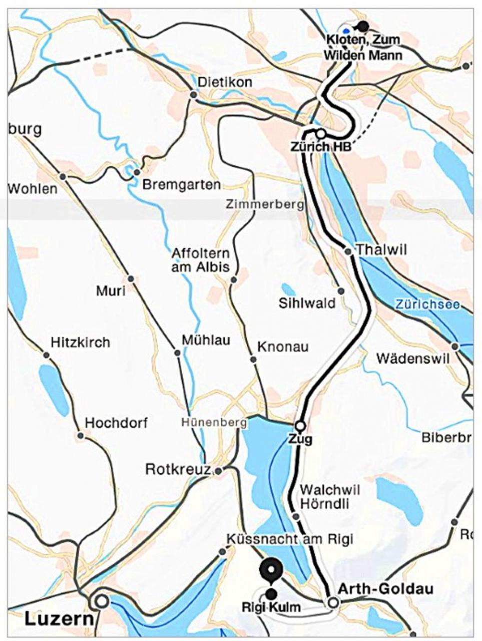 ホテルからリギ山までのSBBで調べた経路の地図(SBBのHPより)
