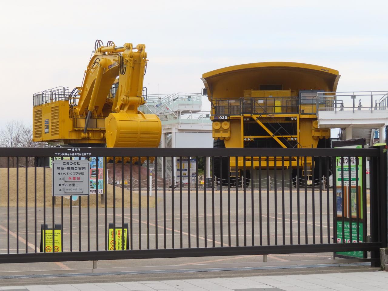 ダンプカーの向こうにあった「わくわくコマツ歴史館」、ほかに「わくわくコマツキッズ館」というものも。そんなだったらいっそ休日開館にした方がよいのでは。