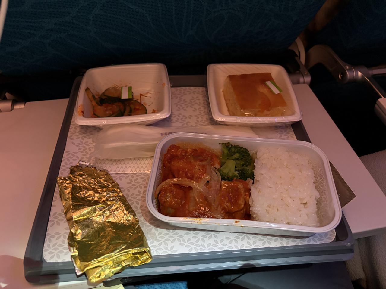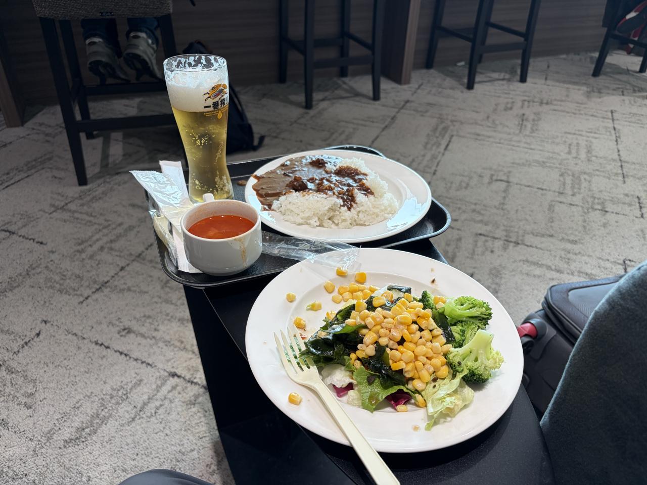 このあと搭乗する福岡⇒ソウル便はLCCで機内食が出ないので、ここぞとばかりに?ご飯とビールを詰め込みます。