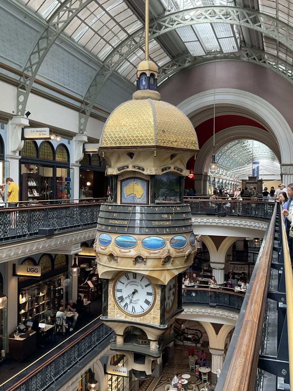 これは世界最大の吊り時計、グレートオーストラリアンクロック。ほんとに立派です。傘の下の部分にはオーストラリアの歴史が描かれているとか。あとで調べてわかりました。もっとよくみておけばよかった。