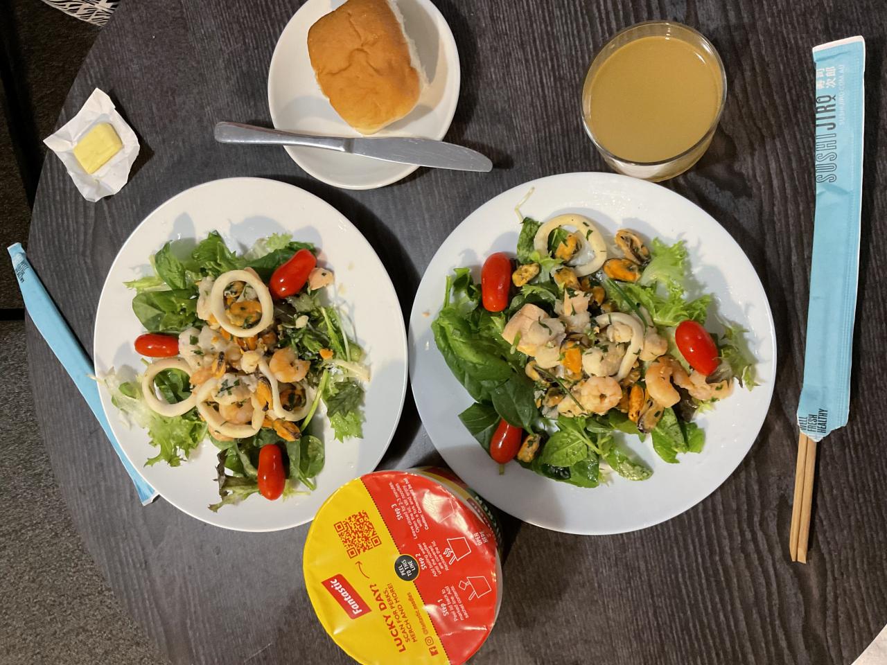 帰りがけスーパーの鮮魚売り場でシーフードの盛り合わせを買いました。ホテルに戻りバター炒め。パンとラーメンとビール。