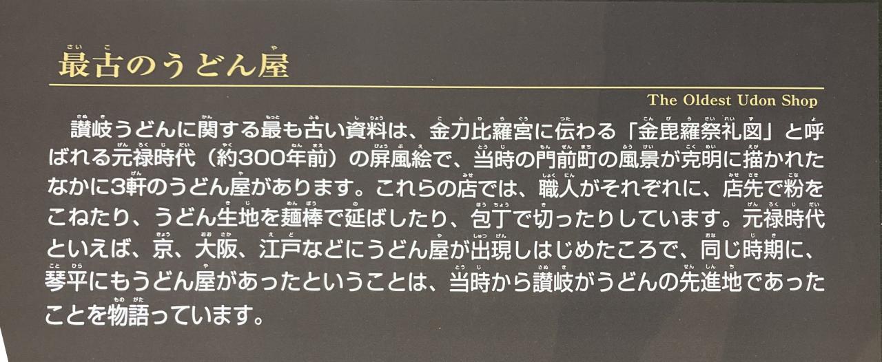 これらの店では 、職人がそれぞれに 、店先で粉をこねたり、うどん生地を麺棒で延ばしたり、包予で切ったりしています。元禄時代といえば、京、大阪、江戸などにうどん屋が出現しはじめたころで、同じ時期に、琴平にもうどん屋があったが、 当時から讃岐がうどんの先進地であったことを物語っています。 -