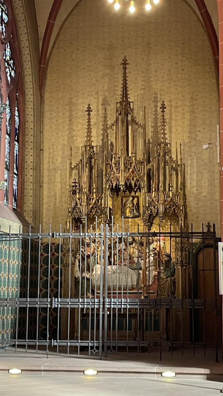 ドイツ騎士団教会(Deutschordenskirche)。聖マリア被昇天教会(St. Maria Himmelfahrt)とも呼ばれている。中央の門には、ドイツ騎士団の紋章とフランクフルト市の紋章が飾られています。
