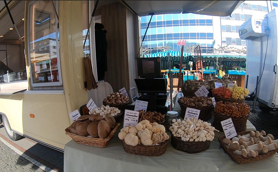 旬の野菜全般(ジャガイモ、キャベツ、ズッキーニなど)。、リンゴ、ナシ、ベリー、サクランボ、プラムなど豊富。新鮮な肉や、ドイツ名物のソーセージ、サラミ・乳製品: チーズ、牛乳、パン・焼き菓子。はちみつ、ジャム、生絞りジュース、リンゴ酒、ワイン、ビール、手作りマスタードなどを販売。