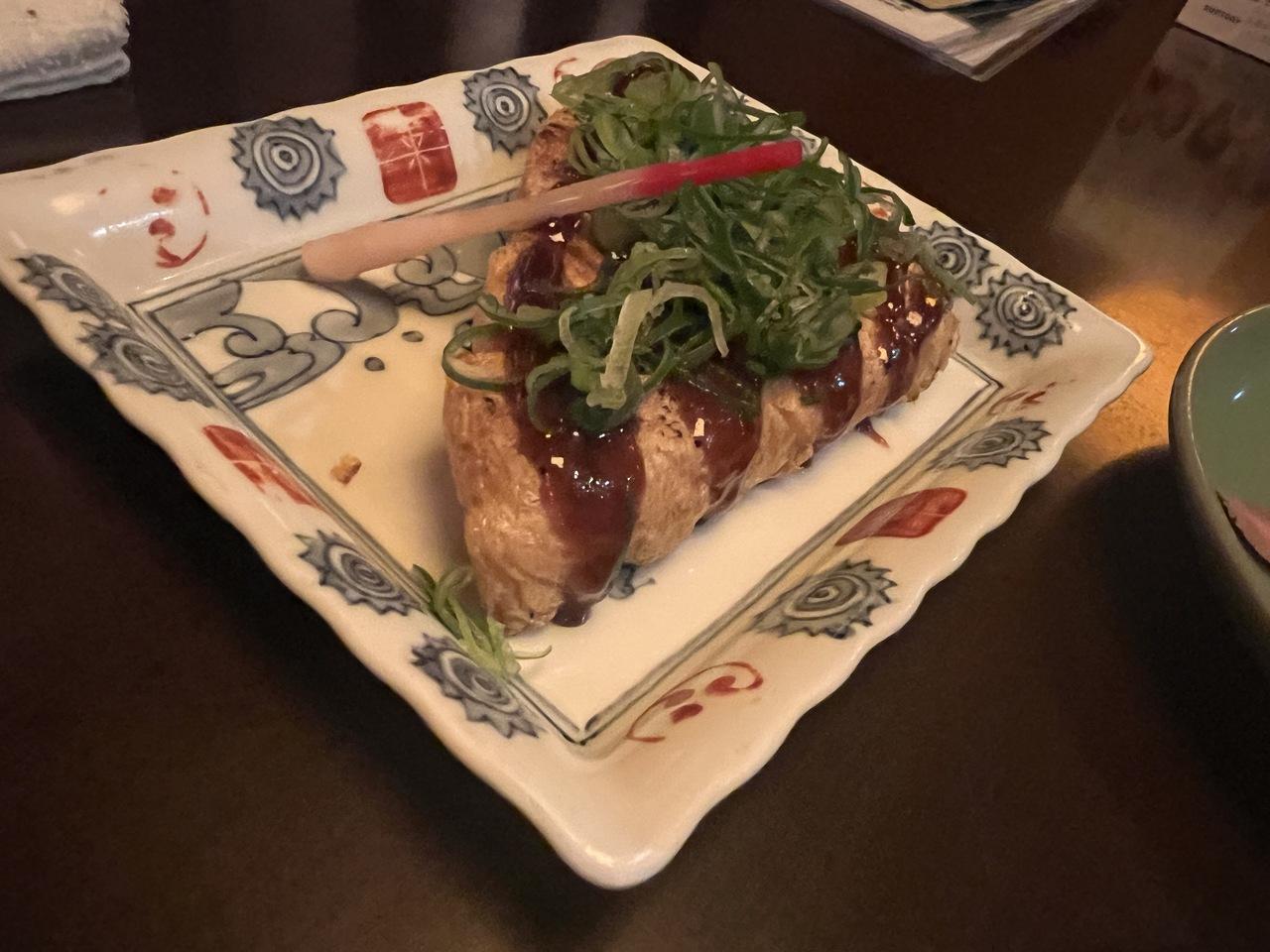 これお通し。イカの塩辛みたいなのを焼くらしい。お通しでひとりひとりにこんなの出てきてびっくり。