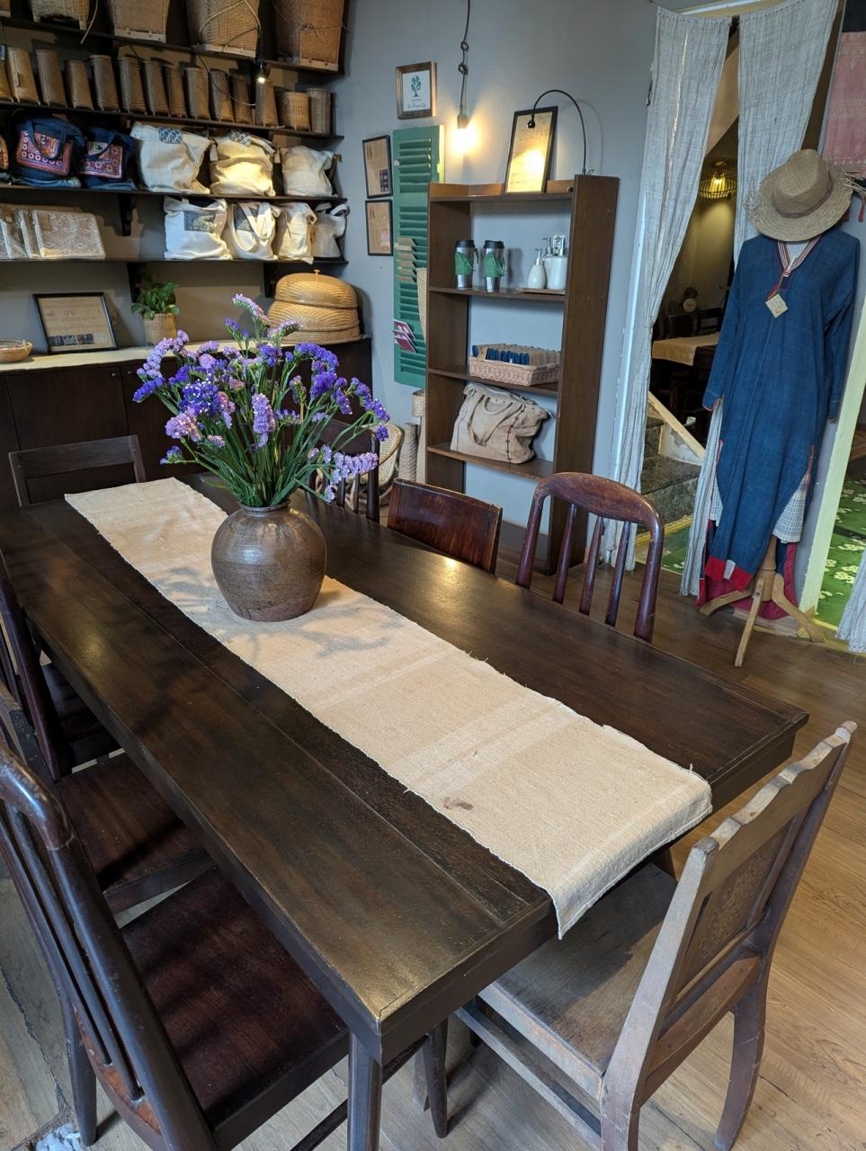 2階のテラスから川を眺めながら、インテリアと同様の美しい飾り付けのランチをいただいてご機嫌!
