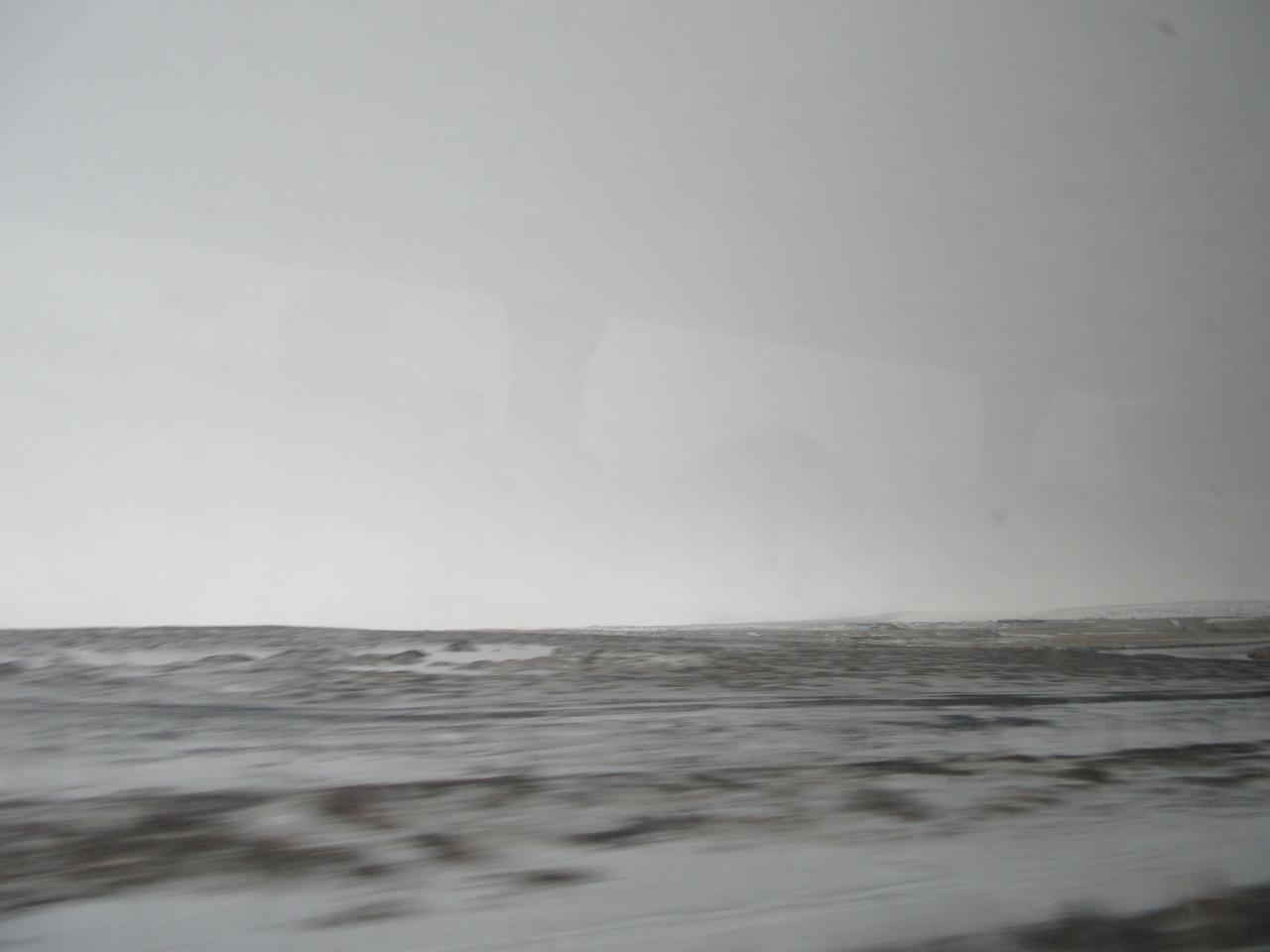 観光に出発。車窓には雪景色が広がっています。寝不足で眠いです。