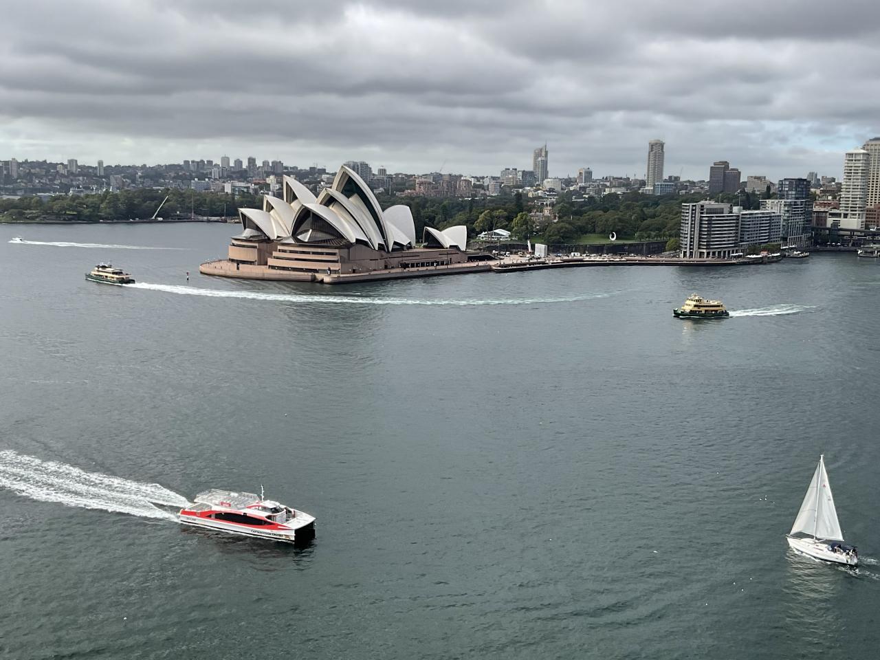 橋の上から見たオペラハウス。船が行き交っているのを見てると足が止まります。