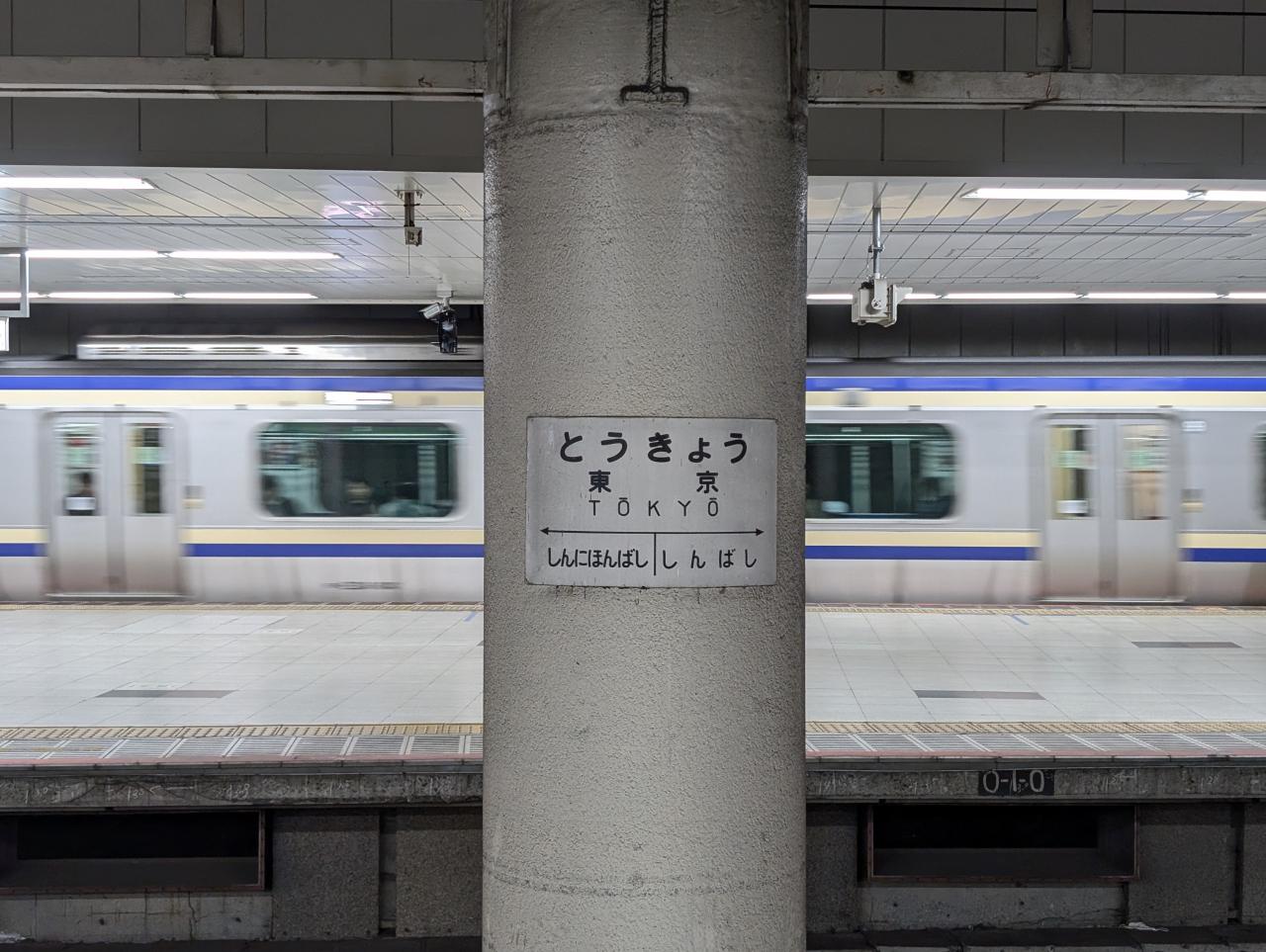総武地下ホームの2番線・3番線の間の柱にレトロ駅名標が設置されています。 -
