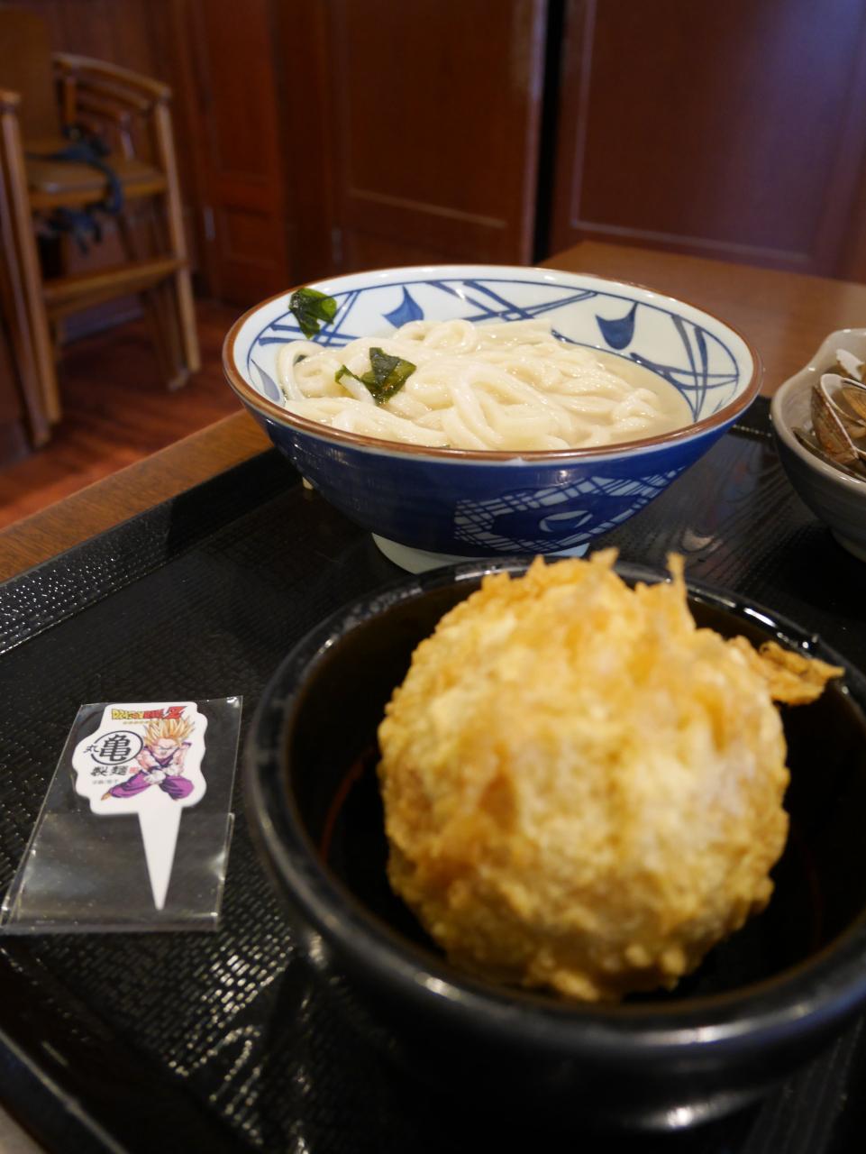 ドラゴンボールZのコラボ商品「元気玉おにぎり半熟玉子入り」中身の作り置き在庫が無かったのか、完成までに時間がかかり、出来たころにはうどんの上のアサリは食べてしまいました。