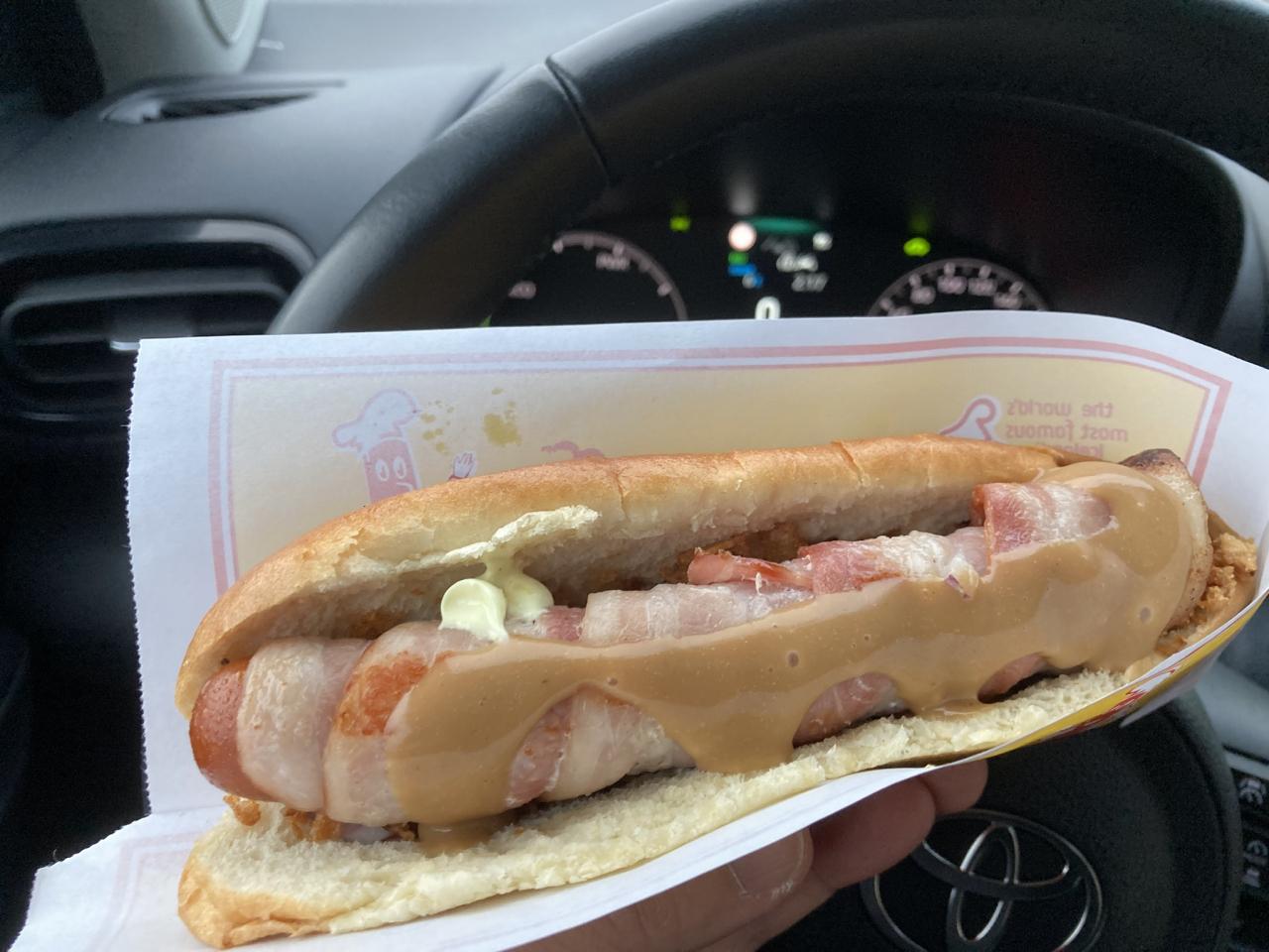 よくわからないまま、ベーコン巻きのスペシャルなホットドックを注文。 -