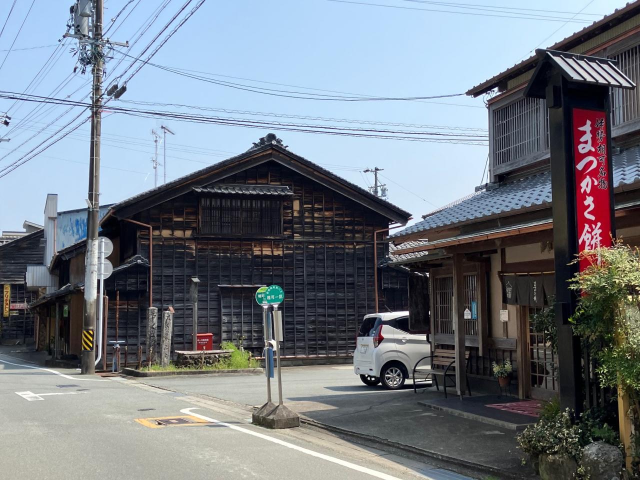 相可宿までは松阪駅から大石行の路線バスに乗り宿場町の中心部、相可一区で下車。私以外に乗降客はありませんでした。写真右手にある「長新」さんでまつかさ餅を購入しようと入店したところ、20分以上待つとの由。バスが10分近く遅れての到着だったので、諦めて出発しました。 -