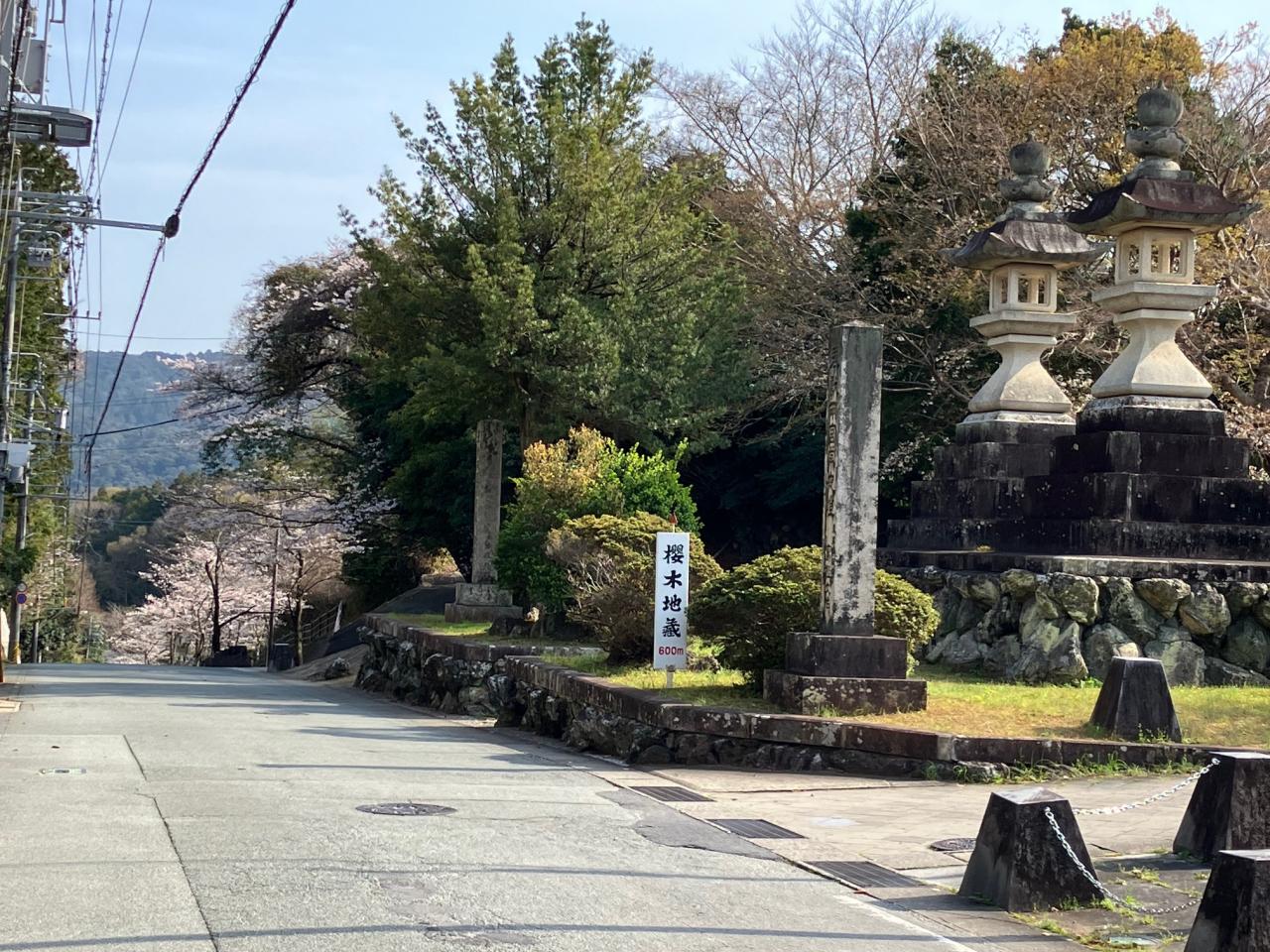 午前11時50分、晴天の相可宿を出発。宿場内にある青木製菓さんで伊勢いもまんじゅうを購入し、宿場を出ると畑や林の中を通る平坦な道が続き、竹林に入り伏拝坂の切り通しを抜けると今度は人家が点在する平坦な道に代わり、対面に満開の一本桜が見える常夜燈を備えた遥拝所で小休止。先ほど購入した伊勢いもまんじゅうを食しながら給水。