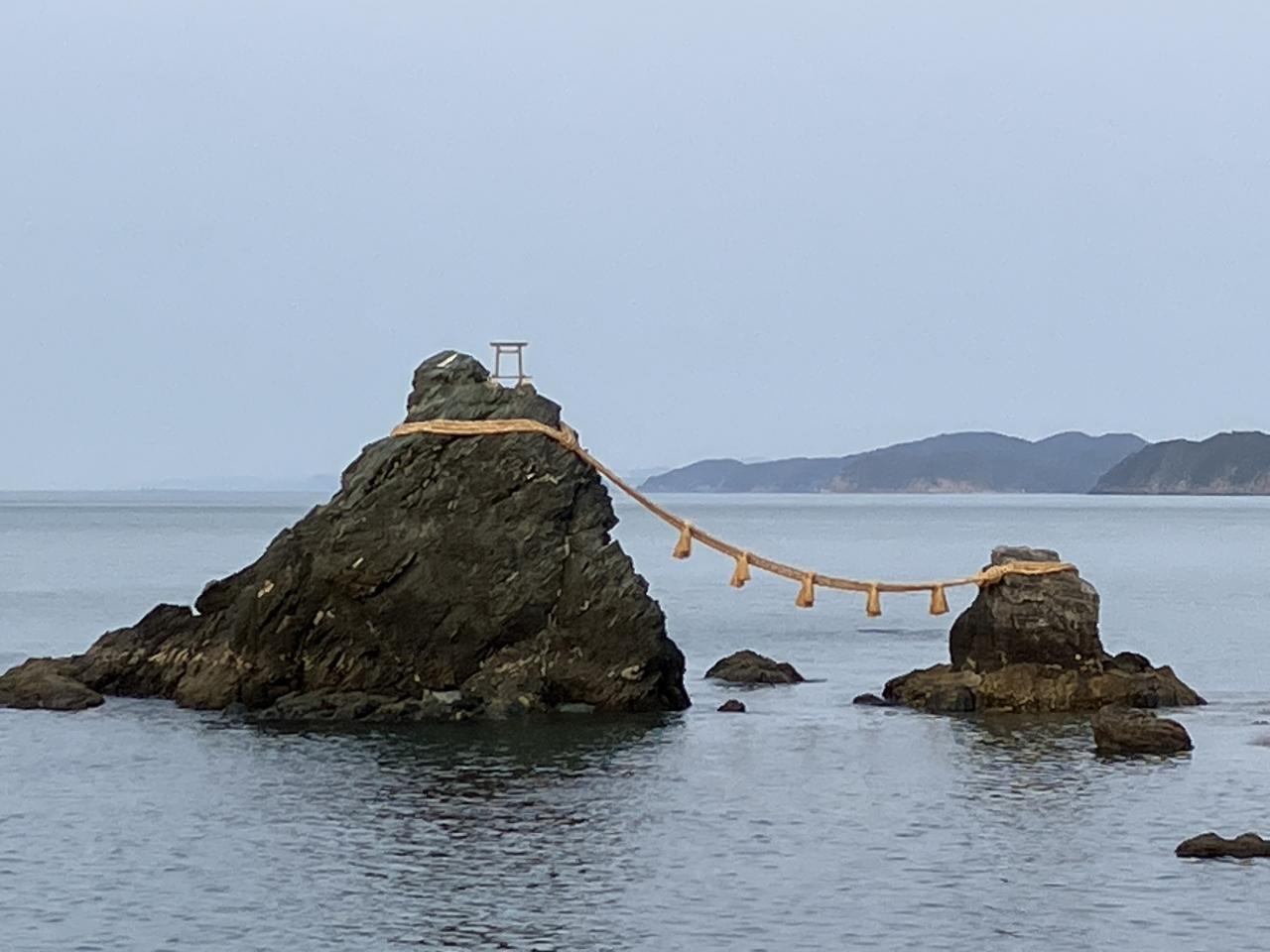 左に見える男岩(おいわ)と右に見える女岩(めいわ)を結ぶ大注連縄(おおしめなわ)は「結界の縄」と称されており、文保年間(1317~1319年)には既に張られていたと言いますから、700年の歴史があります。