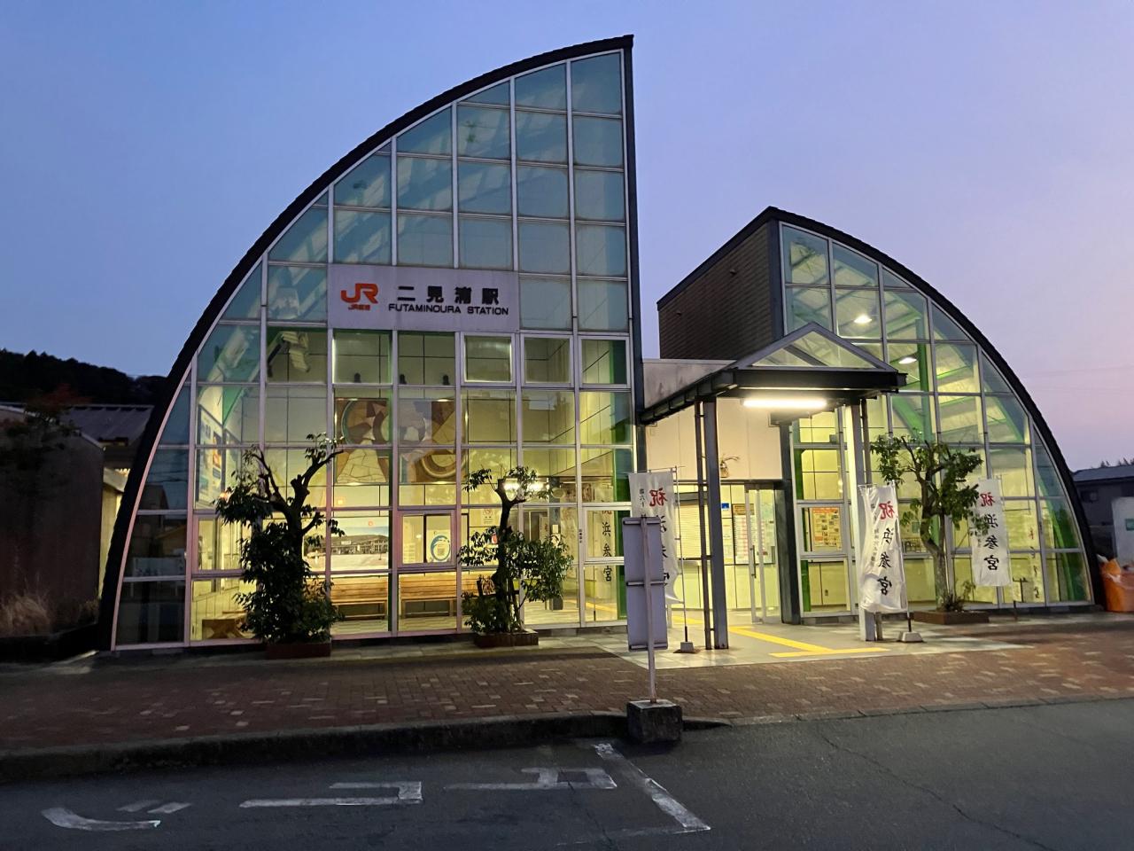モダンな駅舎は夫婦岩をモチーフに平成5年(1993年)に建て替えられたのだそうです。今も残る長大なホーム、広い駅前広場。かつての繁栄ぶりが伺えます。 -