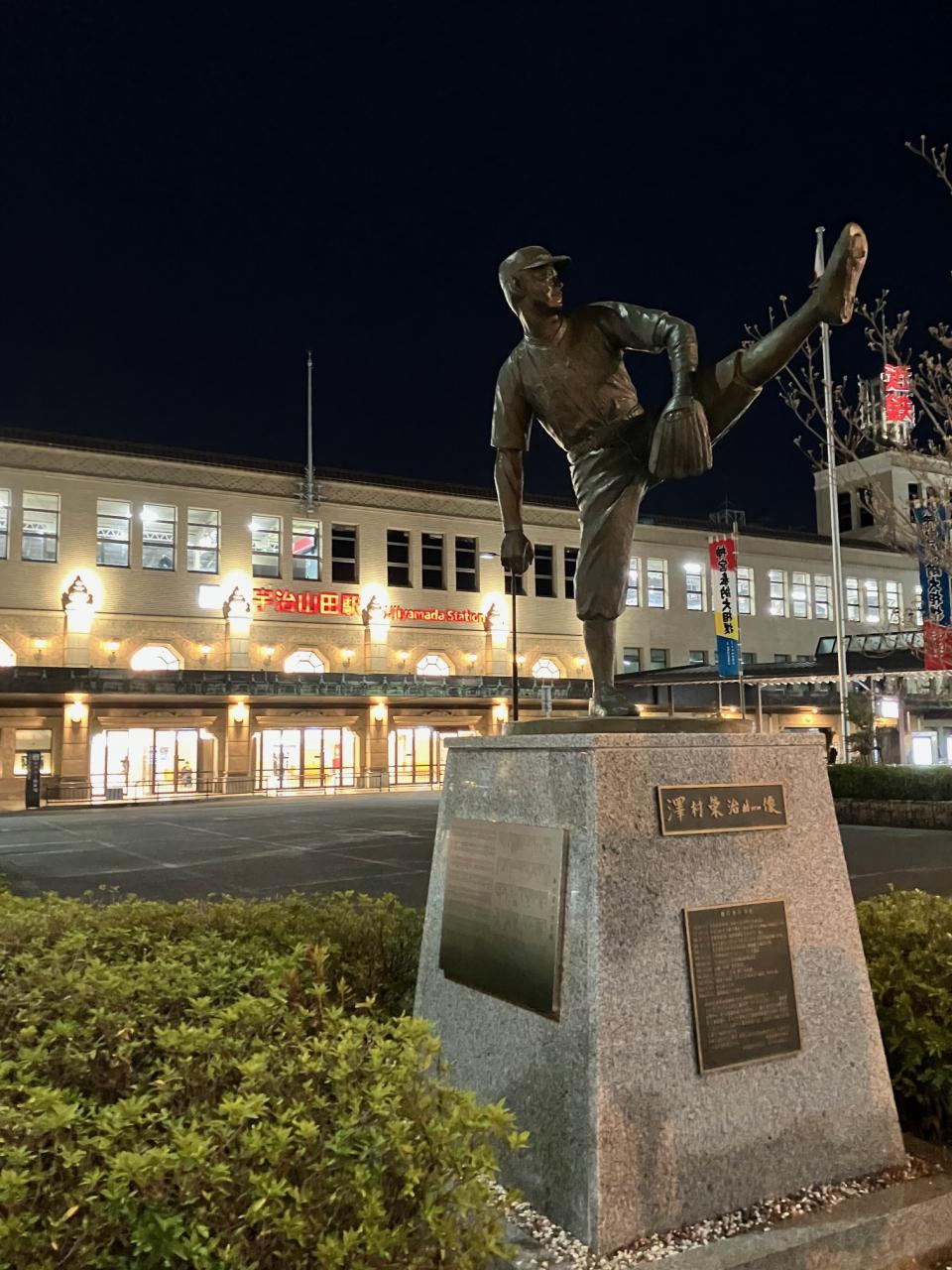 昭和6年(1931年)に開業した姿そのままに威厳を放っている近鉄宇治山田駅。平成13年(2001年)には国の登録有形文化財に登録されています。伝説の大投手でありながら、先の戦争で非業の死を遂げた沢村栄治の銅像が不思議と駅舎とマッチしています。